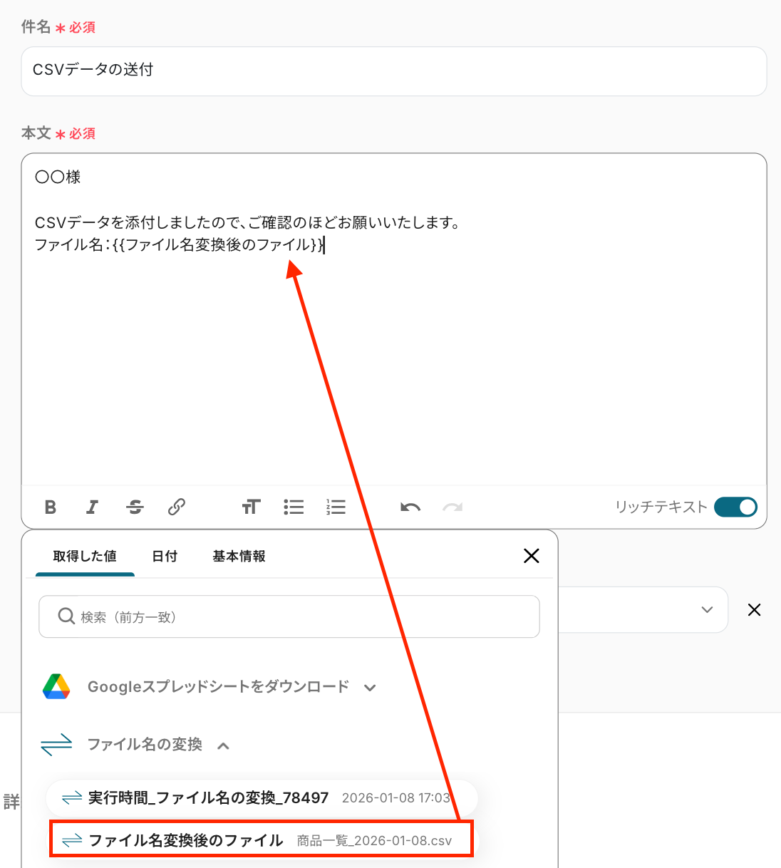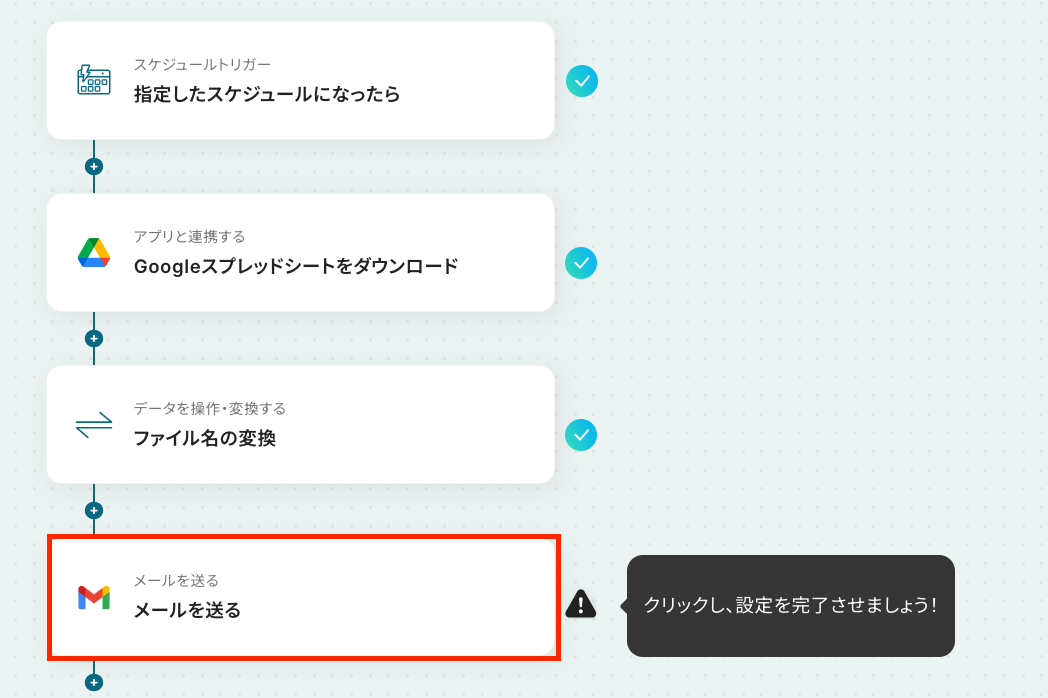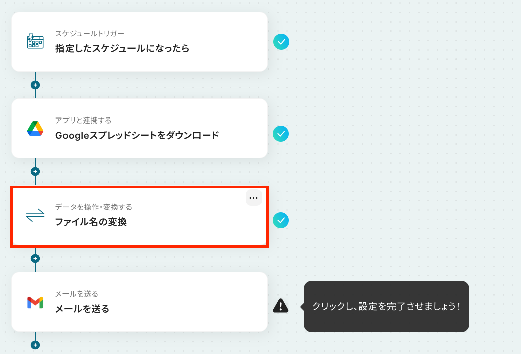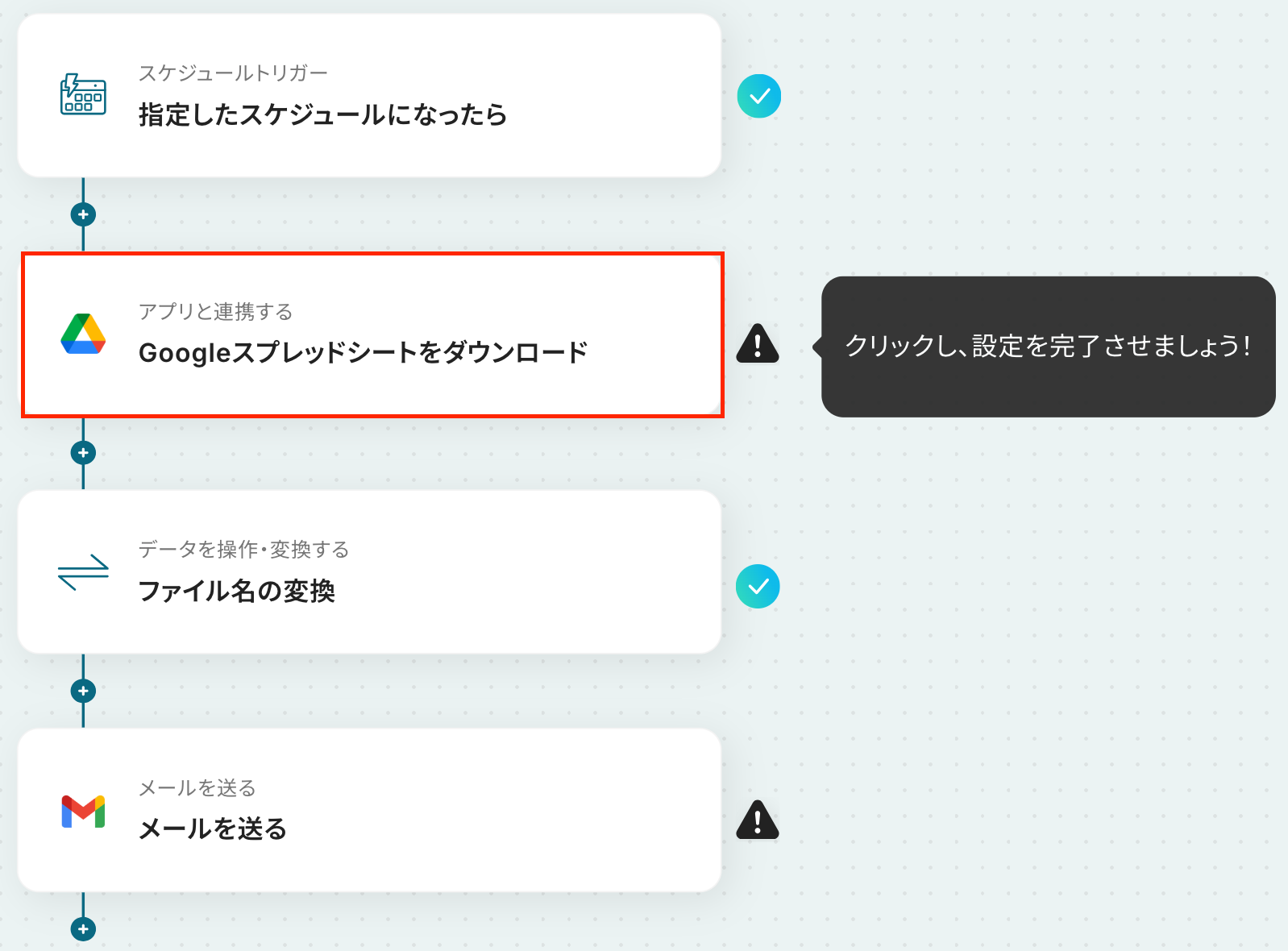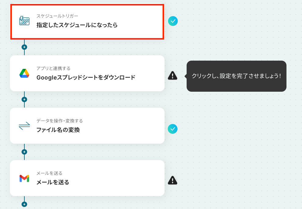 スケジュールトリガーでは、ワークフローを起動させたい日時(毎時、毎日、毎週、毎月など)を任意で設定してください。 Google Driveからダウンロードするアクションでは、対象となるGoogle スプレッドシートのファイルIDや、ダウンロードするファイルタイプ(CSVなど)を任意で設定します。 ファイル名の変換アクションでは、ファイル名変換対象の値や変更後のファイル名、ファイル名変換後の取得した値の項目名を任意で設定できます。 Gmailでメールを送信するアクションでは、送信先のメールアドレス(To, CC, BCC)、件名、本文の内容などを任意で設定してください。 ■注意事項