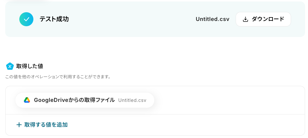 「テスト」をクリックします。 テストに成功すると、取得した値が表示されます。※ 取得した値 とは? トリガーやオペレーション設定時に、「テスト」を実行して取得した値のことを指します。 後続のオペレーション設定時の値として利用でき、フローボットを起動する度に変動した値となります。