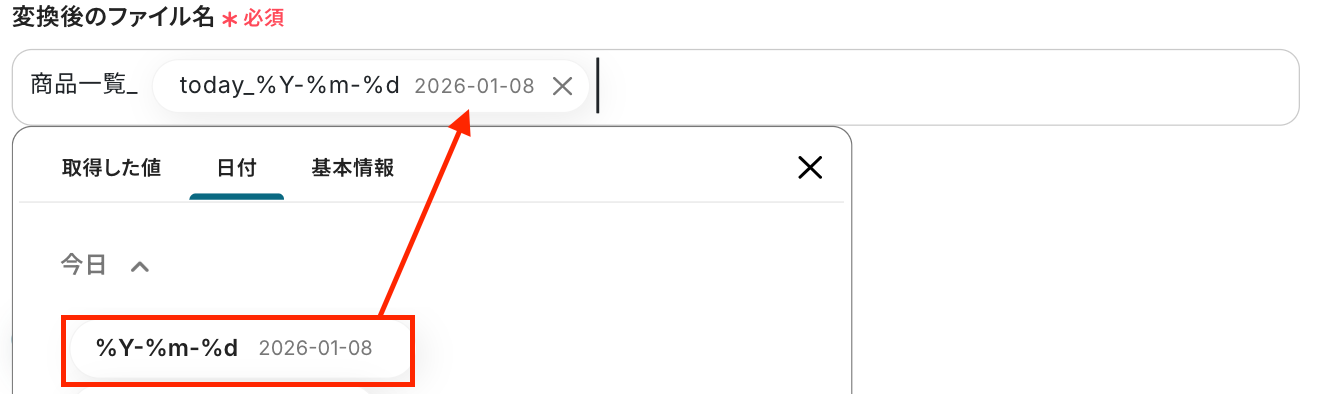 「変換後のファイル名」 は、下記画像のように日付変数を用いるなど自由に設定しましょう。 日付変数についての詳しい説明は、以下のヘルプページをご確認ください。
