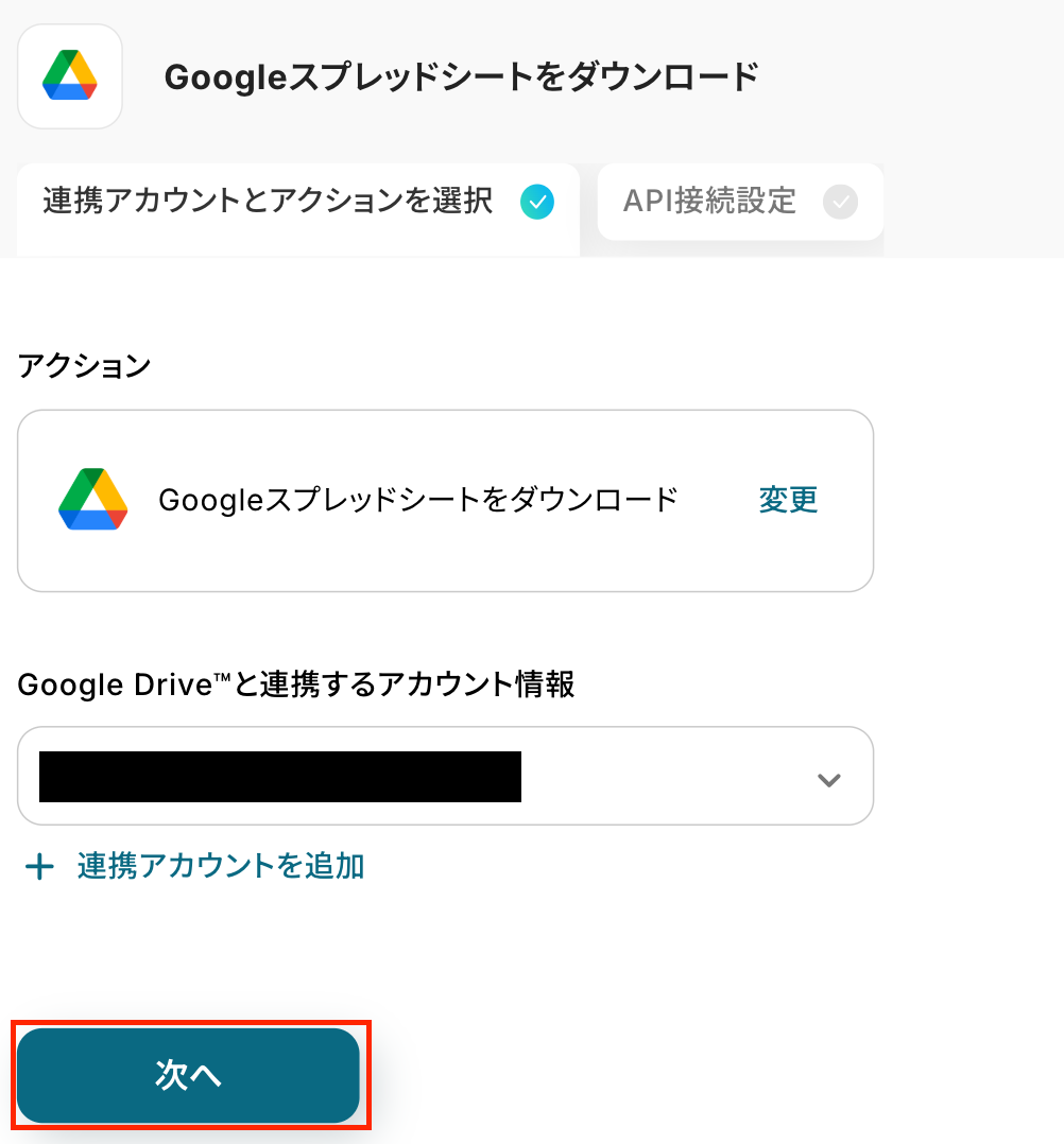 アクションはそのままで、連携するアカウント情報を確認します。 「次へ」をクリックして進みましょう!