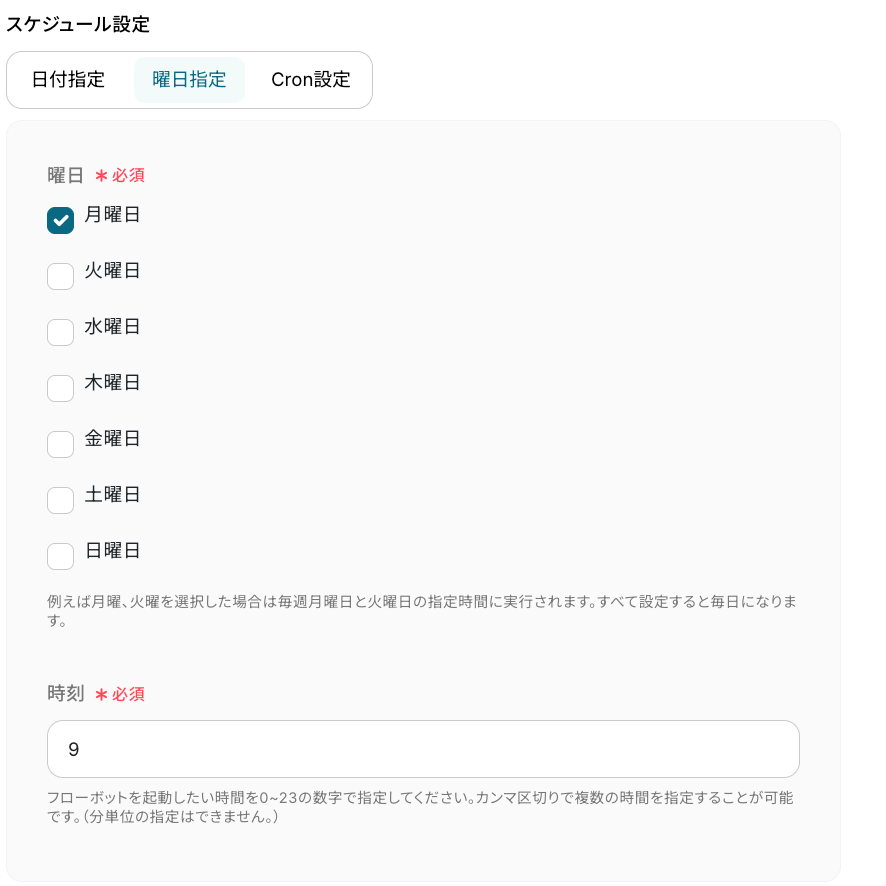 スケジュールトリガーは、特定の曜日や毎月特定の日時を指定するだけでなく、cron式を用いたより柔軟なスケジュール設定も可能です。 Google Driveのファイル複製アクションでは、ファイル名に実行日時といった変数を埋め込み、動的な名称でファイルを作成できます。 ■注意事項