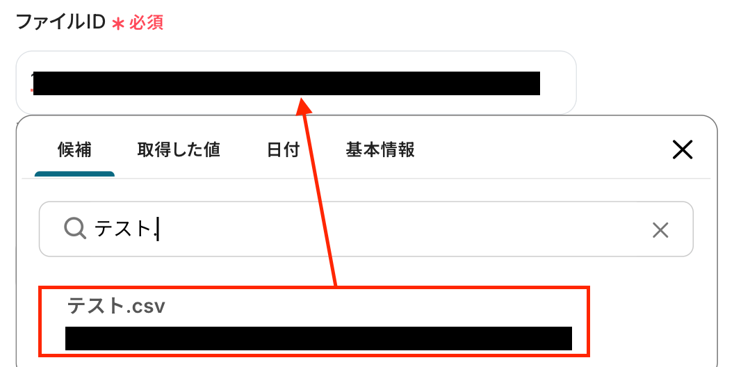 次の画面で必須項目を設定していきます! まずは、「ファイルID」 を設定します。入力欄下の注釈を参照して設定を行ってください。 もしくは、以下のように「候補」から選択することも可能です。