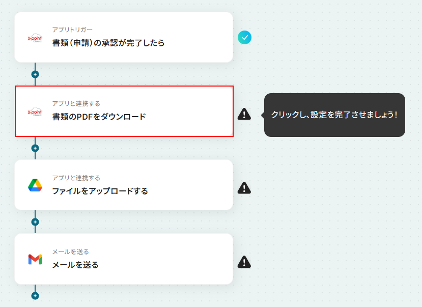 それではここから代表的な例として、X-point Cloudで申請が承認された際に、PDFをダウンロードしてGoogle Driveに自動で保存するフローを解説していきます!