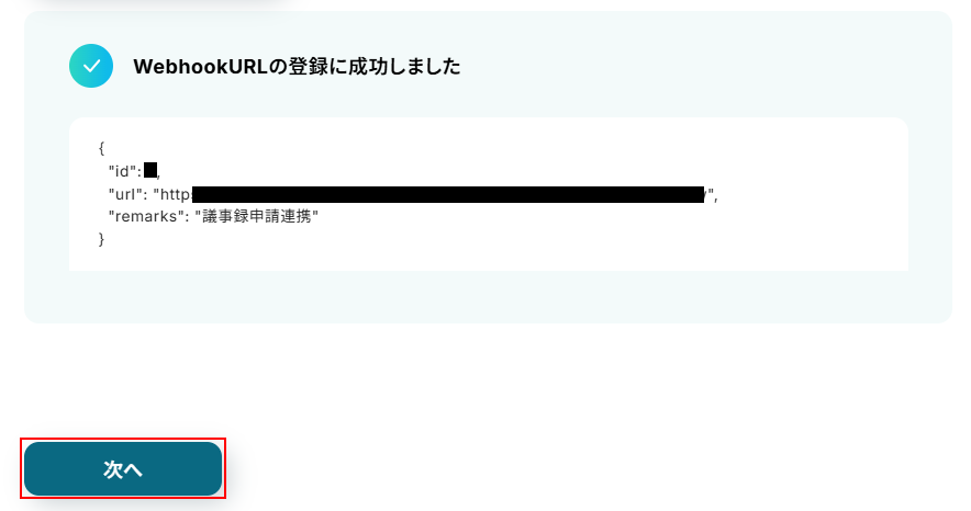 登録に成功すると、WebhookURLの登録に成功しましたと表示されます。