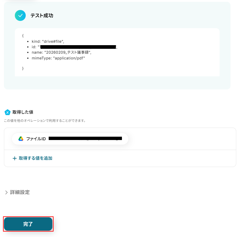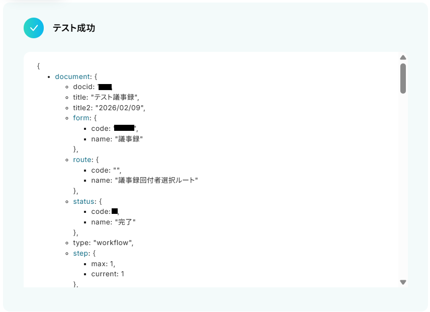 テストに成功するとテスト成功画面が表示され、取得した値が表示されます。
