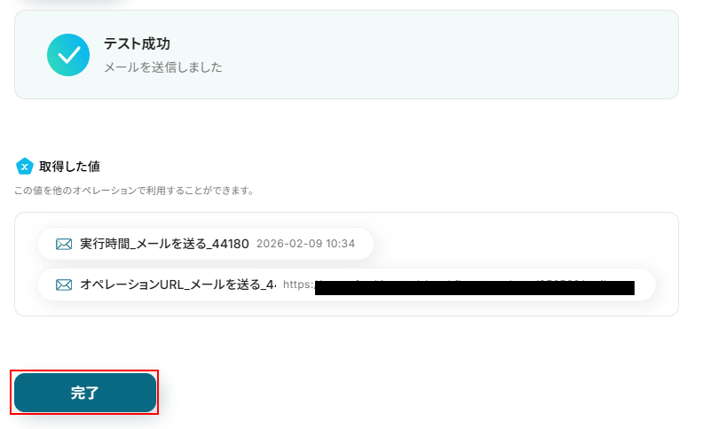 - 最後に、メール機能で「メールを送る」アクションを設定し、処理完了の旨を関係者に通知します