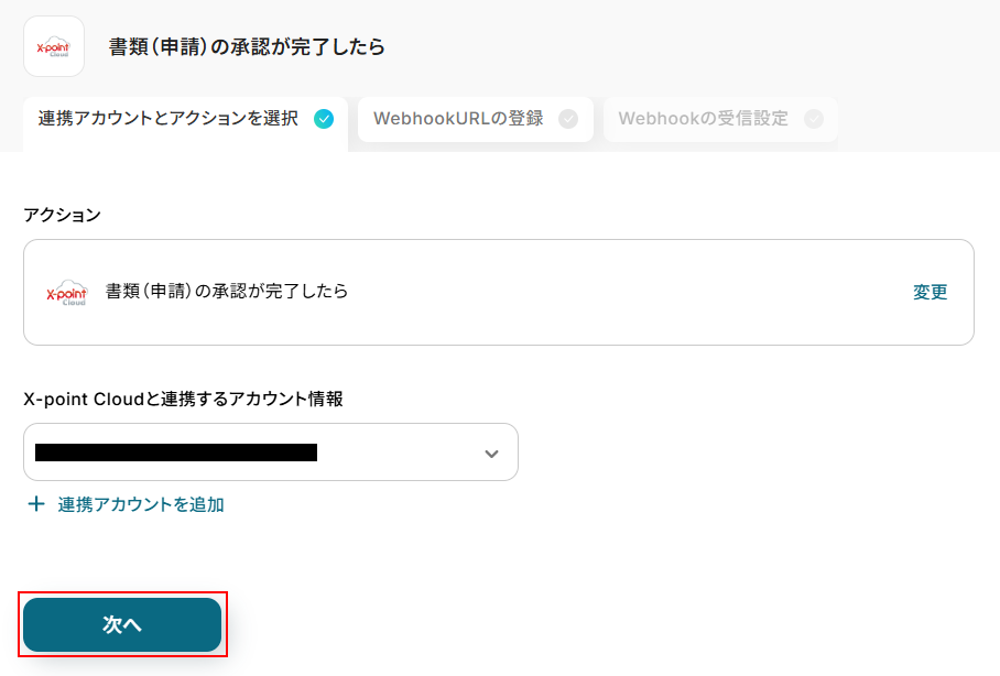 - 次に、トリガーでX-point Cloudを選択し、「書類(申請)の承認が完了したら」というアクションを設定します。