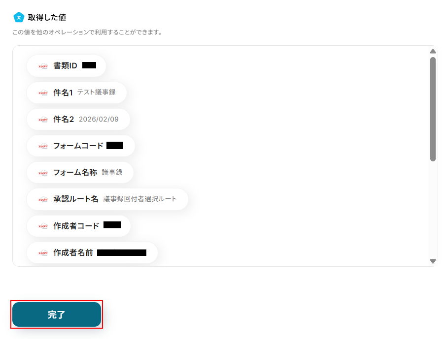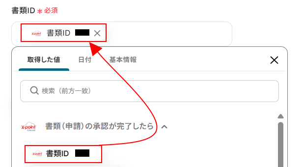 - X-point Cloudのアクションで指定する書類IDやフォームコードは、前のステップで取得した値などを基に任意で設定が可能です