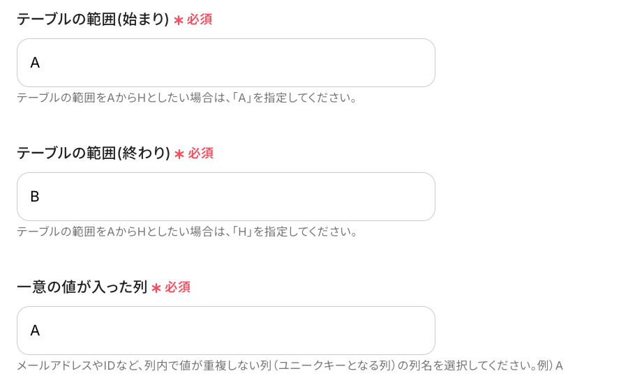 テーブル範囲を設定していきます。 ここでは、先ほど用意した以下のシートを使用するので、 テーブル範囲の始まりは「A」 テーブル範囲の終わりは、「B」です。一意の値が入った列 (列内で値が重複しない列)は、「A」になります。