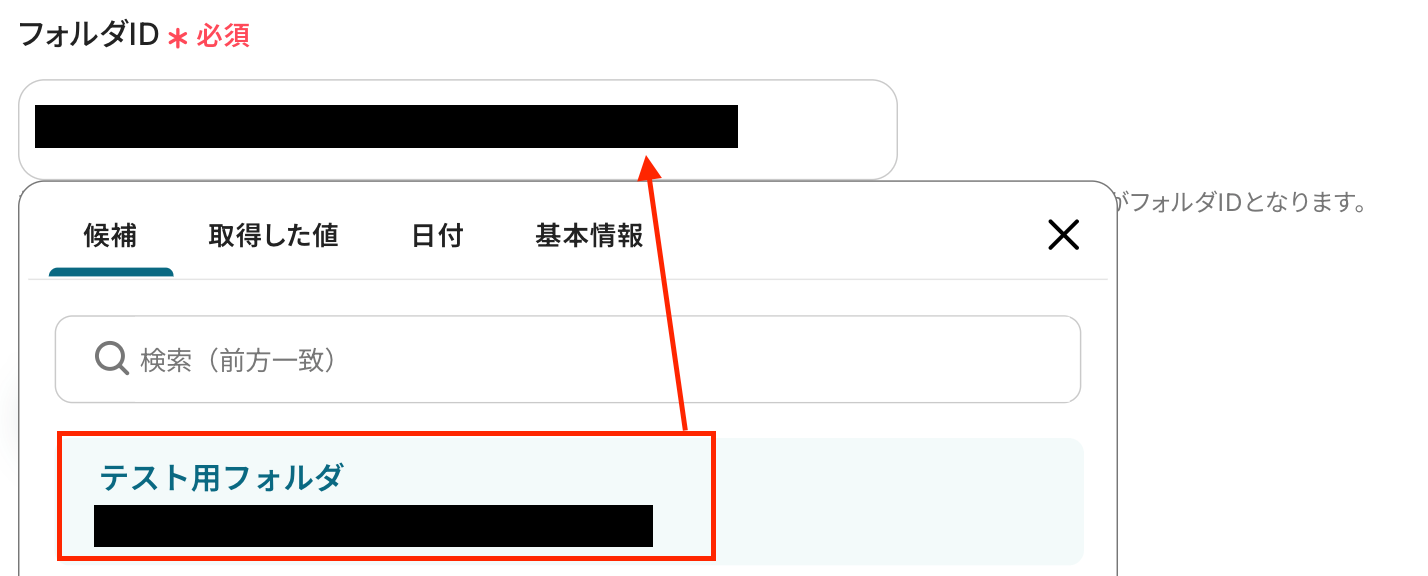 「フォルダID」 は「候補」から選択してください。 ここで指定したフォルダにバックアップされます。