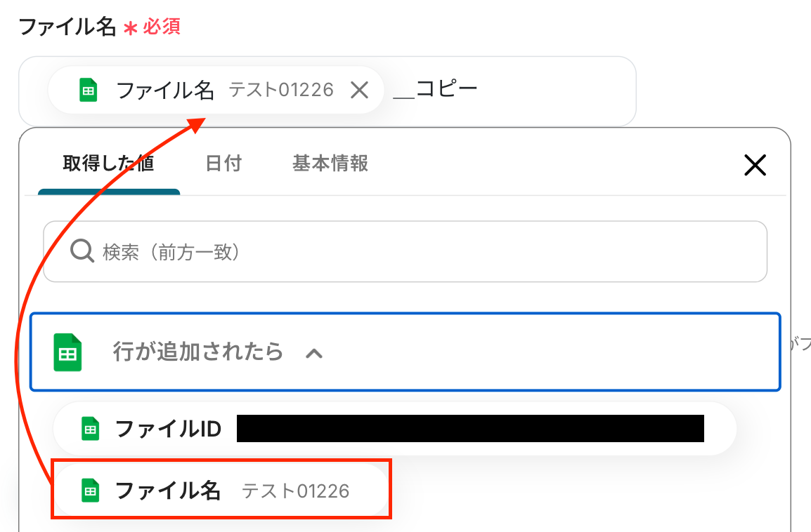 「ファイル名」 も同様に取得した値を引用して設定してください。 「コピー」と入れておくと、複製したファイルということが一目でわかりますね。