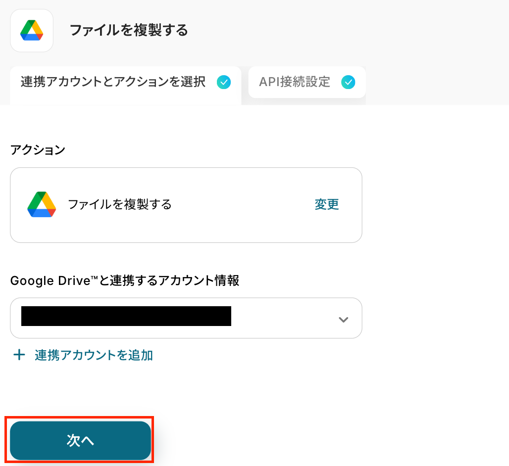 アクションはそのままで、連携するアカウント情報を確認します。 「次へ」をクリックして進みましょう!