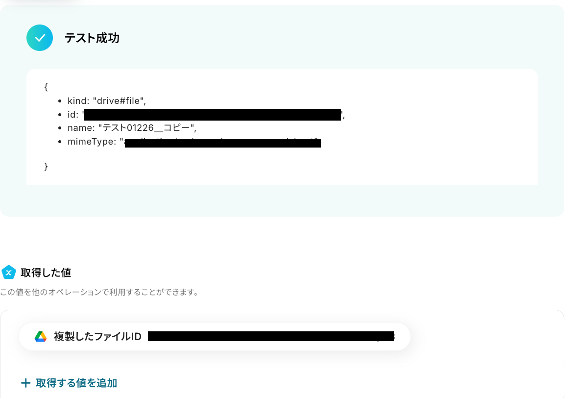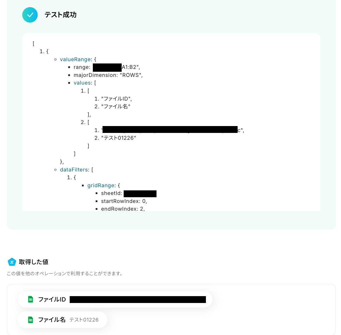 テストに成功すると、取得した値を確認できます。※ 取得した値 とは? トリガーやオペレーション設定時に、「テスト」を実行して取得した値のことを指します。 後続のオペレーション設定時の値として利用でき、フローボットを起動する度に変動した値となります。