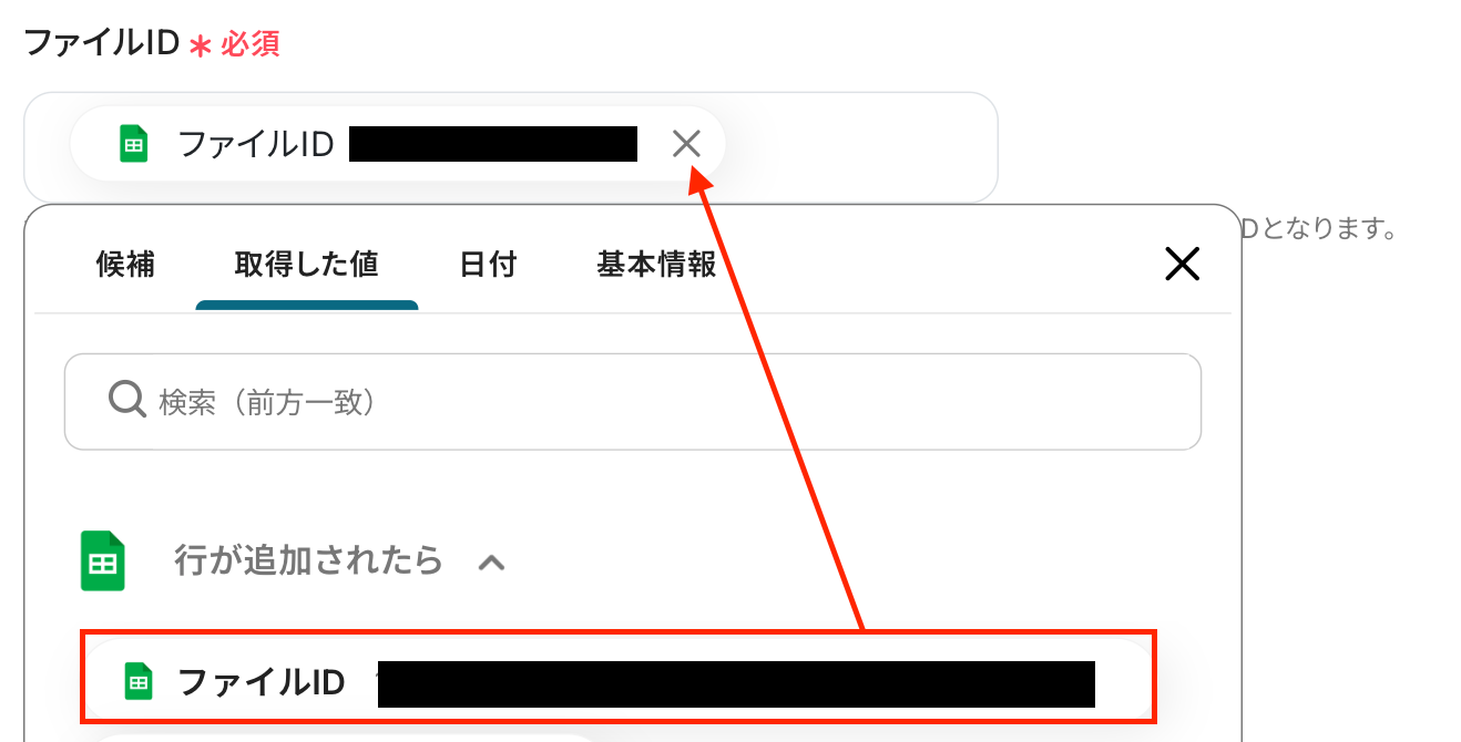 API接続設定画面に移って、「ファイルID」 を設定してください。 以下のように、Google スプレッドシートのトリガー設定で取得した値を選択します。