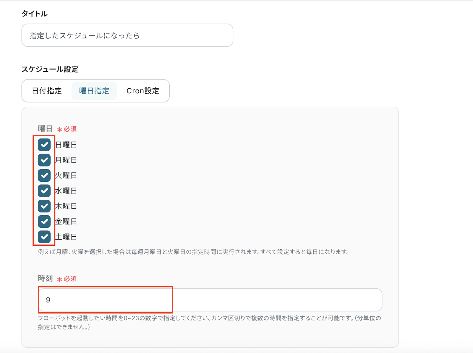 スケジュール設定は、「曜日指定」を選択し、フローボットを起動させたい「曜日」にチェックをして、時刻を入力しましょう。