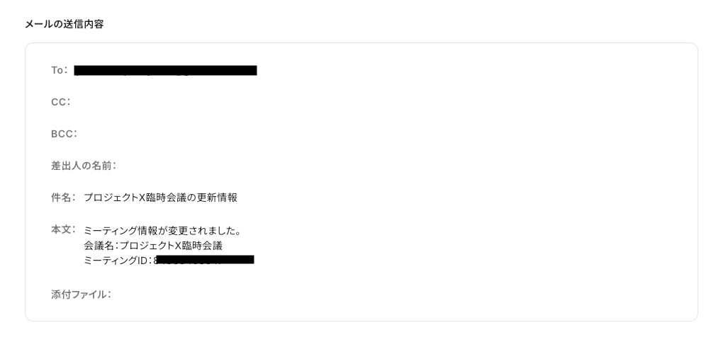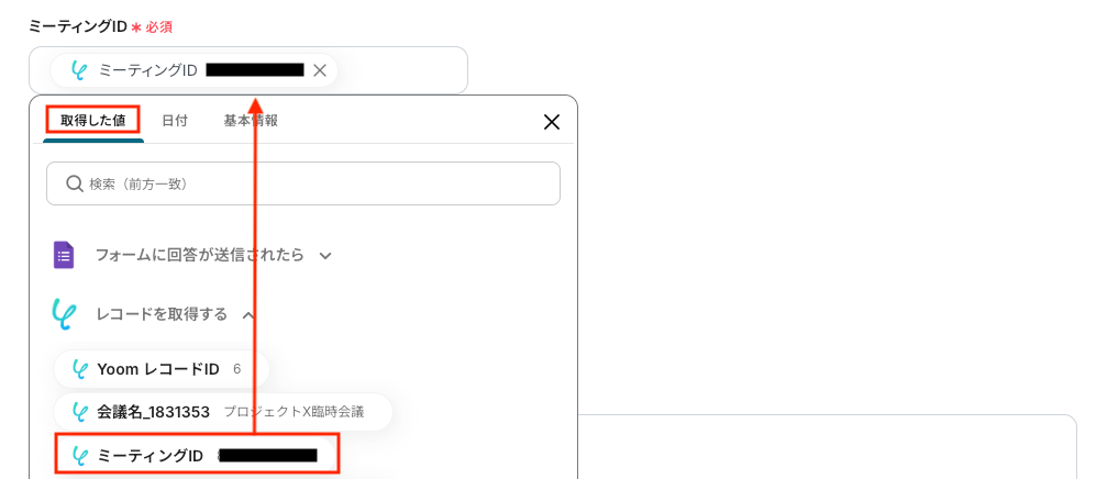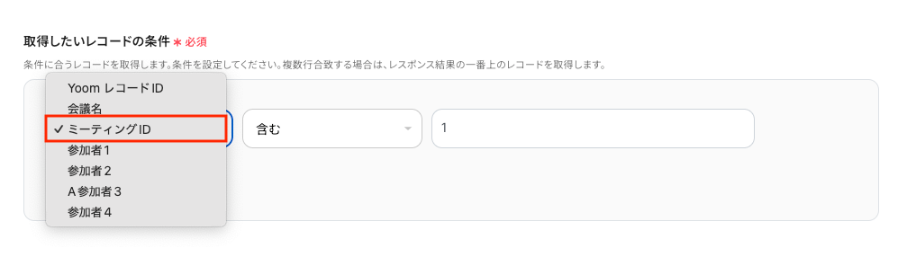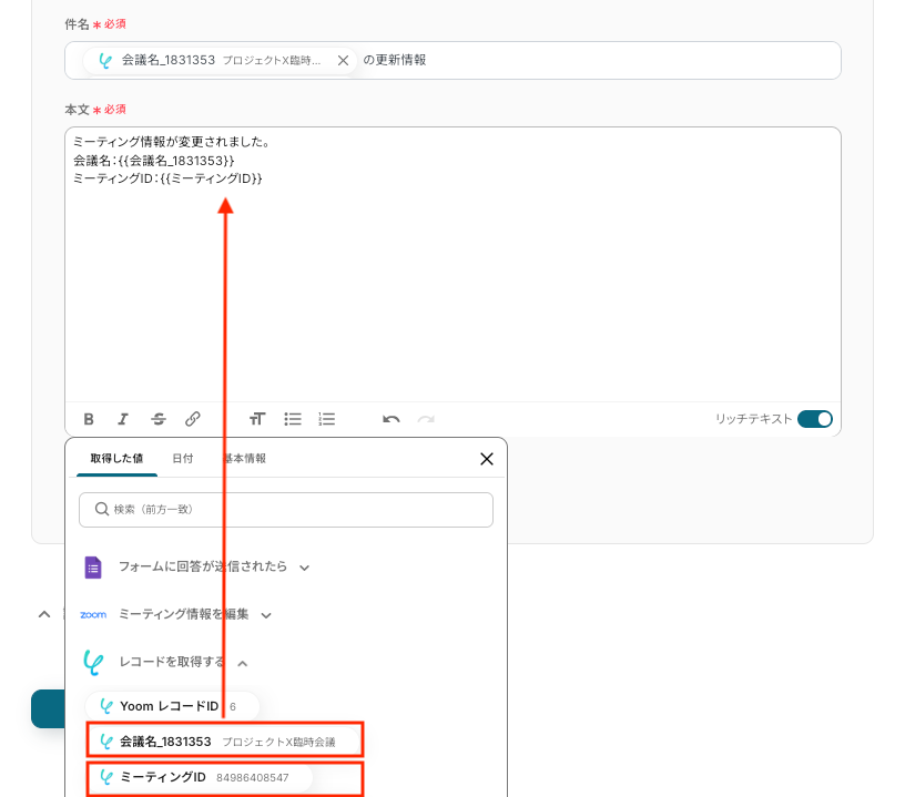 この記事でご紹介した手順と同様に、「レコードを取得する」のオペレーションで、対象のミーティングを指定すると変更できます。