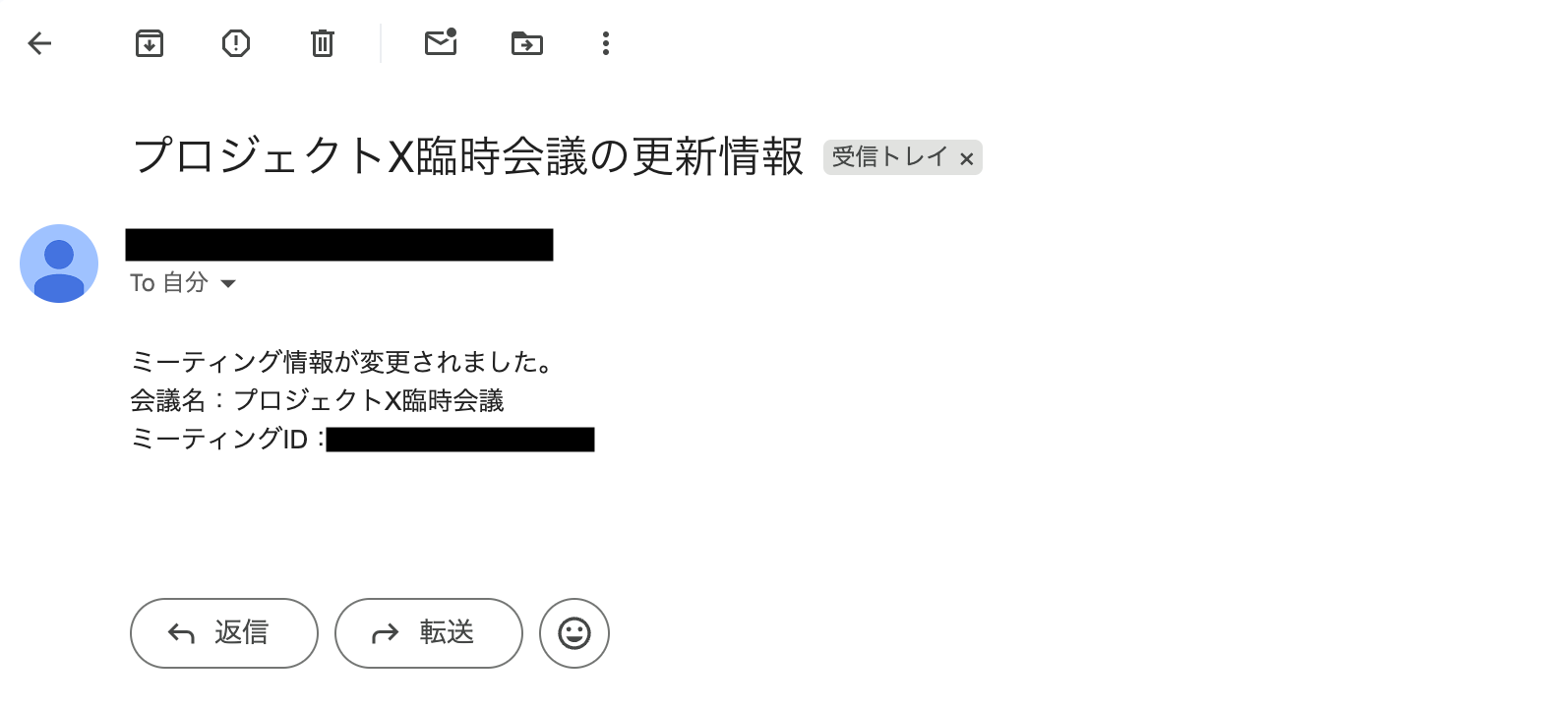 変更後:プロジェクトX臨時会議 2025-11-04 10:00(会議時間90分)