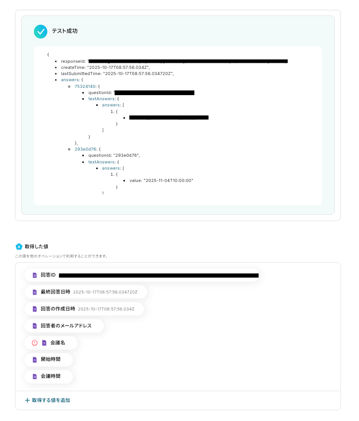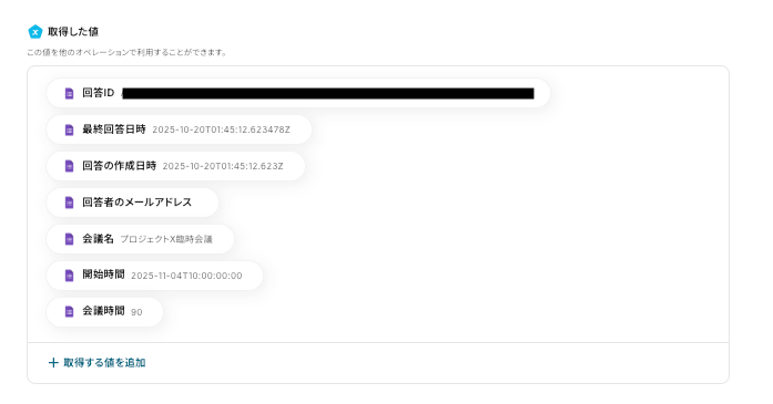 なお、デフォルトで取得した値には、仕様上Googleフォームの回答項目(会議名など)が含まれません。