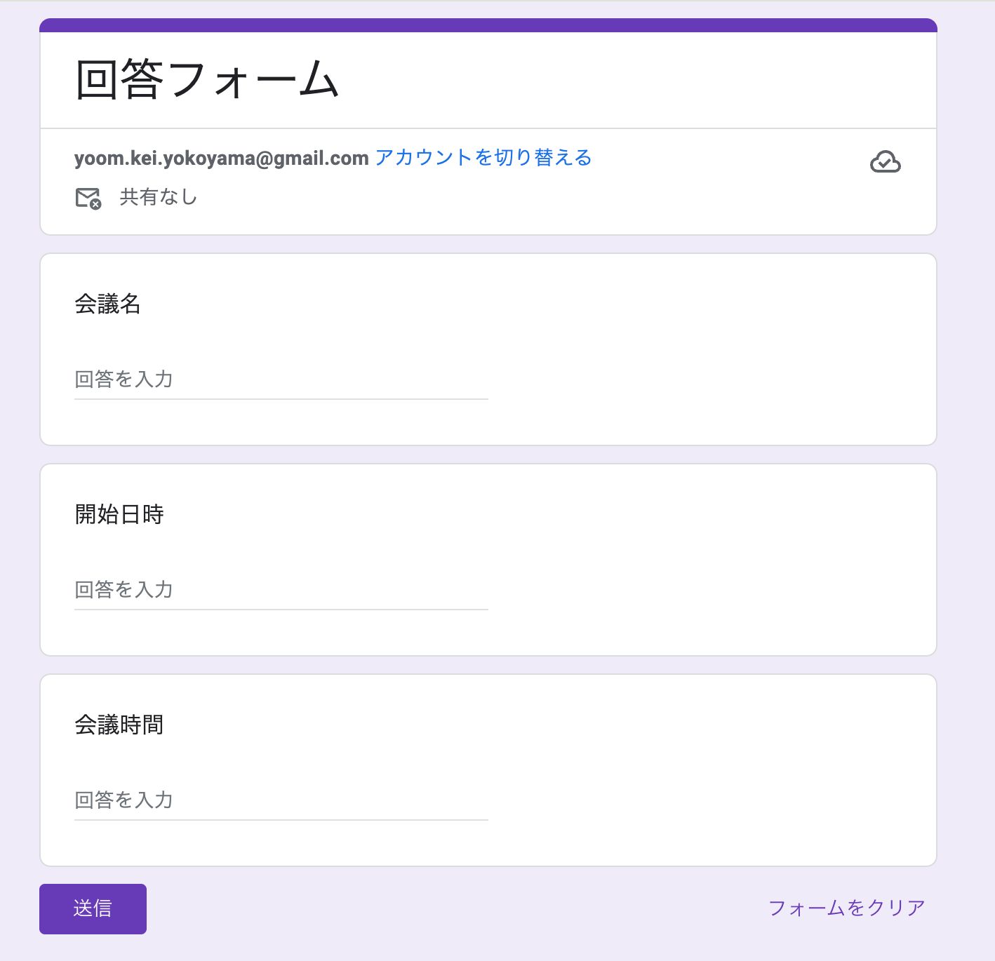 ※この記事では、Googleフォームに指定した内容にあわせて「会議名」「開始時間」「会議時間」の回答項目を追加しています。