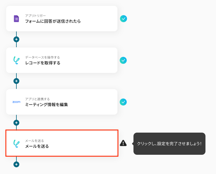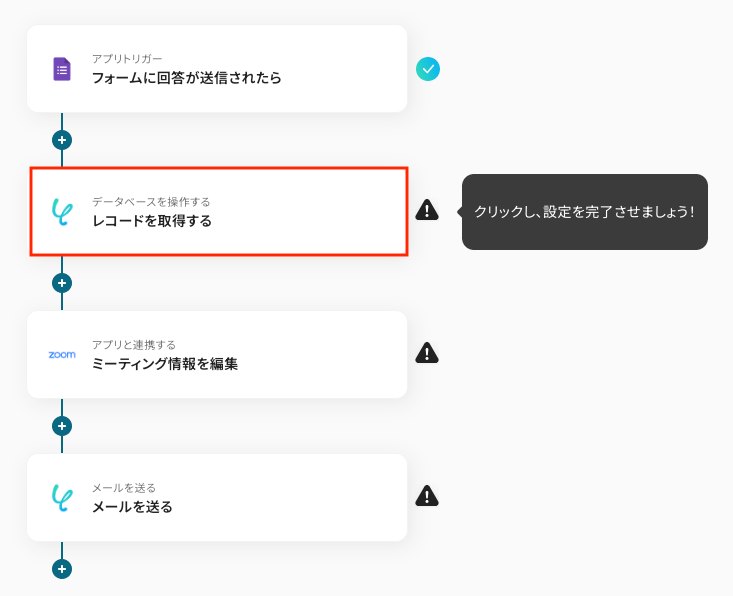 - Googleフォームのトリガー設定、データベースとZoom、メールのアクション設定