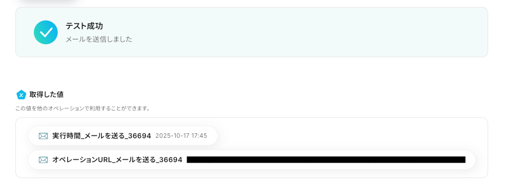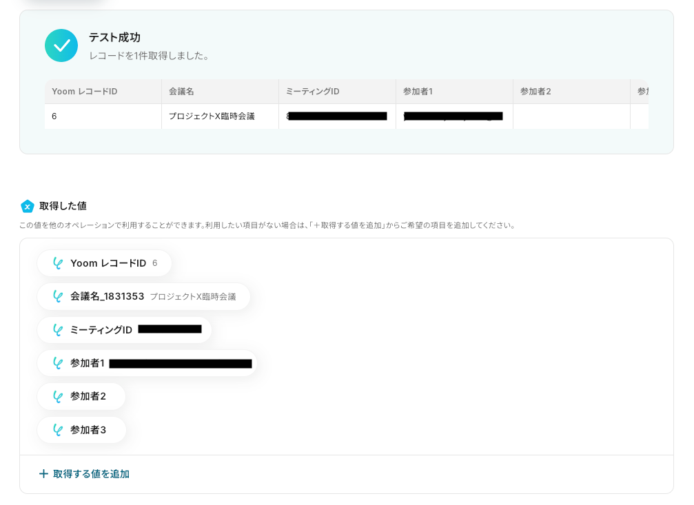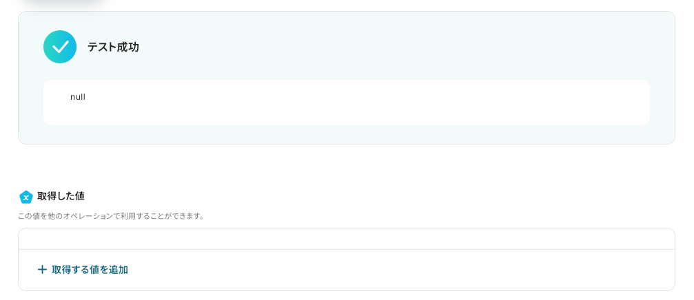 テストが成功すると、以下のように「取得した値」が表示されます。