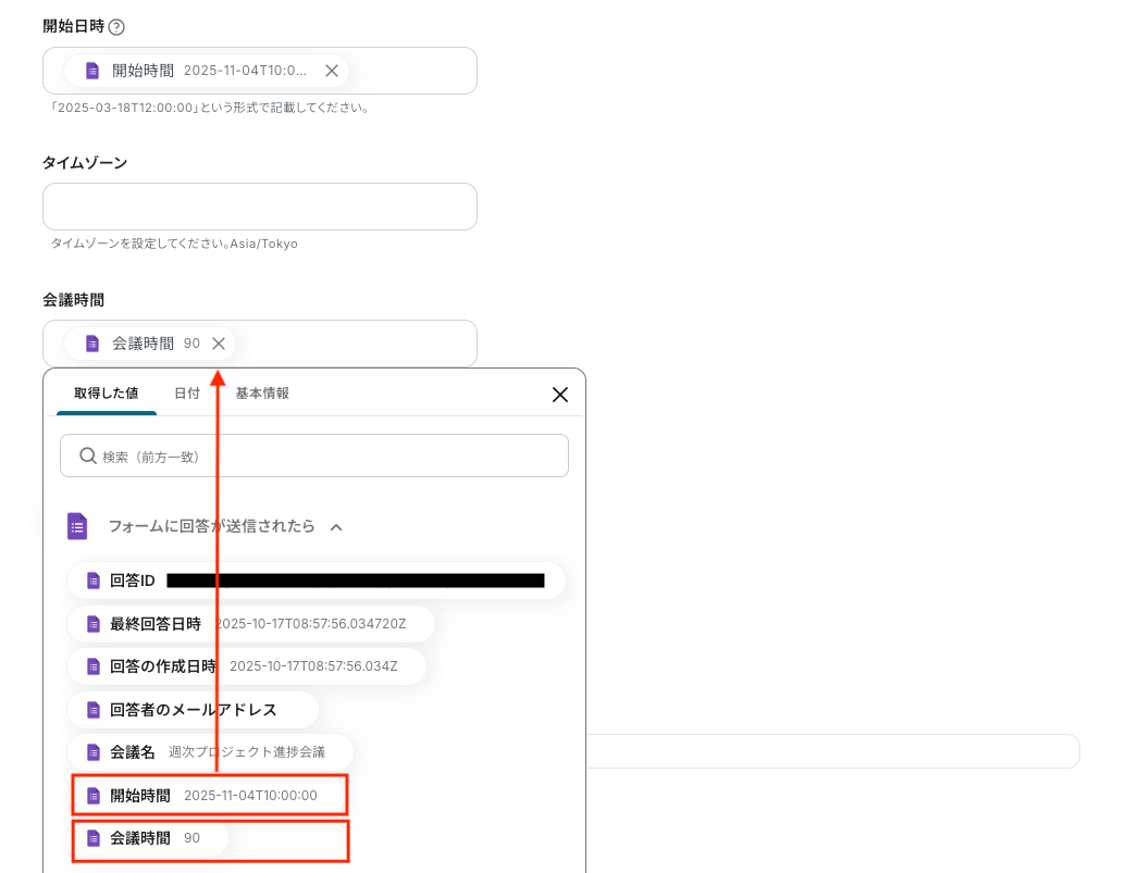 同様に、「開始日時」「会議時間」も取得した値から選択します。
