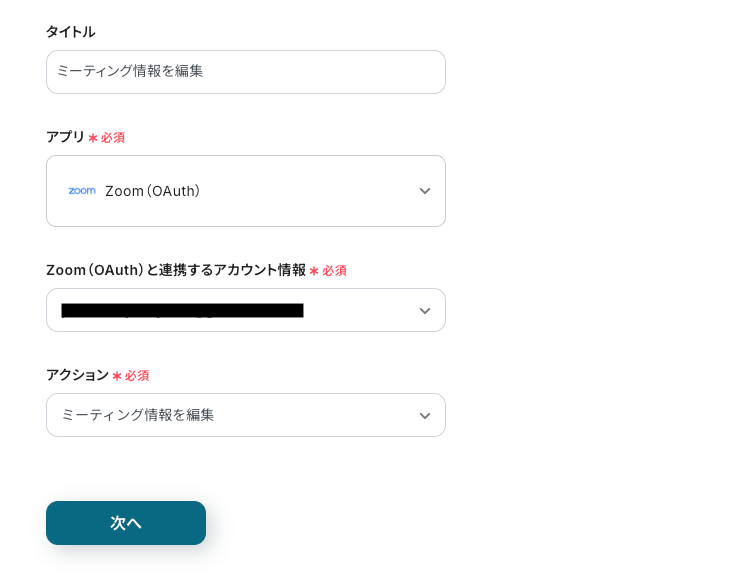 続いて、連携アカウントとアクションを選択に進みます。各項目の確認・入力をし、次に進みましょう!