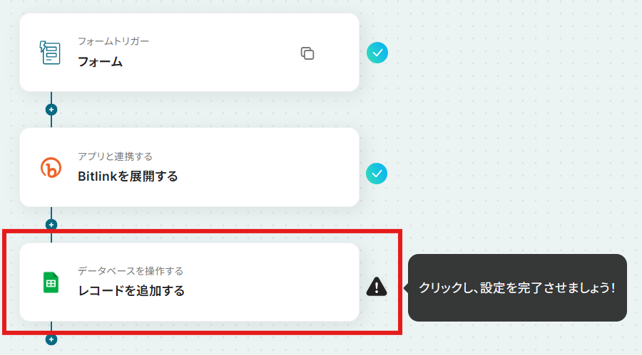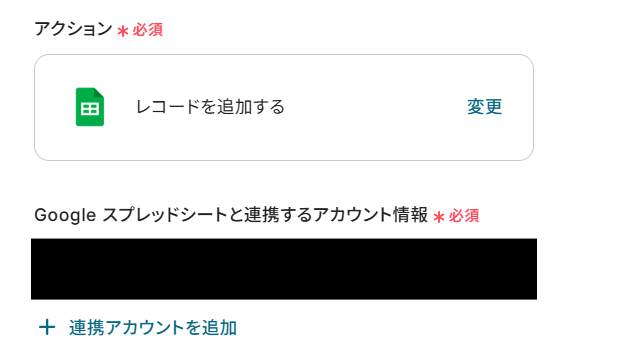 - 最後に、オペレーションでGoogle スプレッドシートの「レコードを追加する」アクションを設定し、生成された短縮URLなどの情報を指定のシートに行として追加します。
