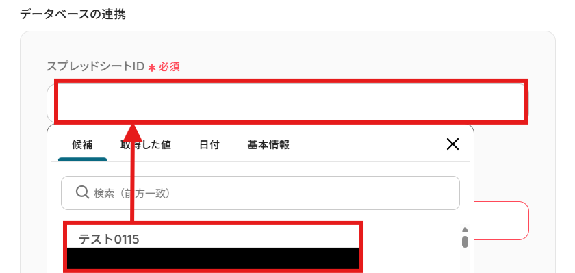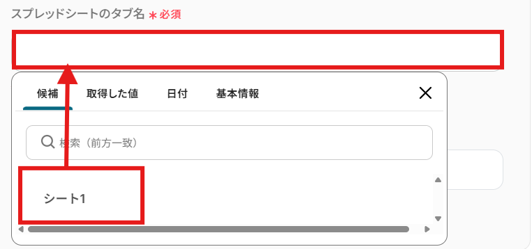 使用したいGoogle スプレッドシートの「スプレッドシートID」と「スプレッドシートのタブ名」を候補から選択しましょう。