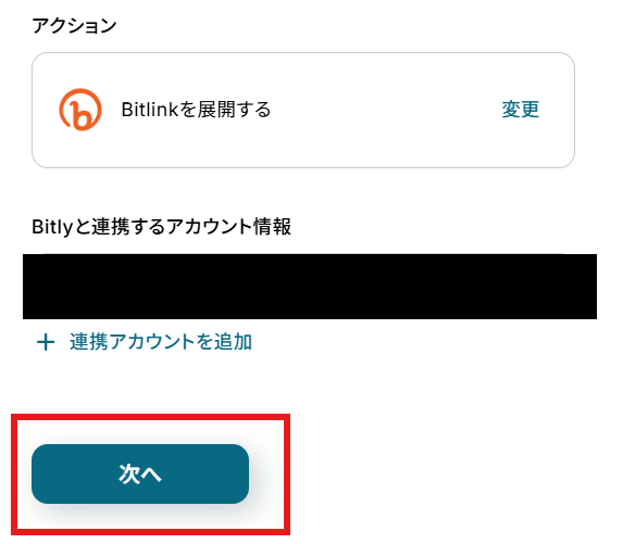 「Bitlyと連携するアカウント情報」を確認し、「次へ」をクリックして進んでください。