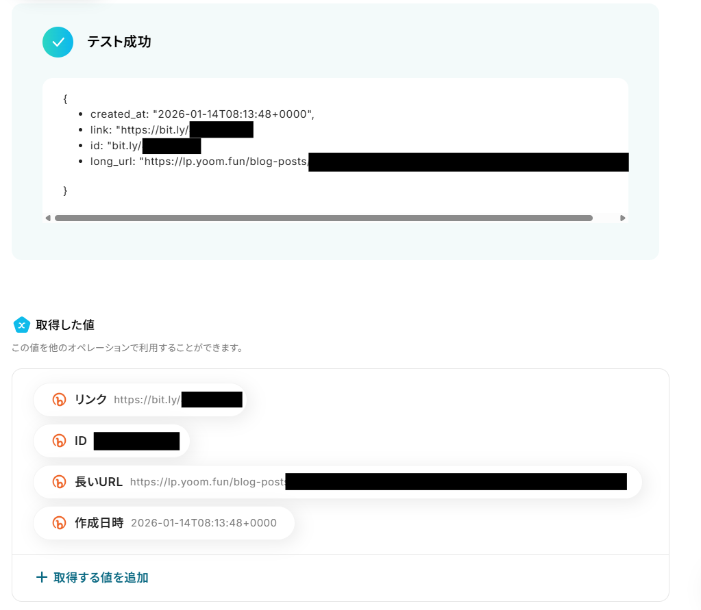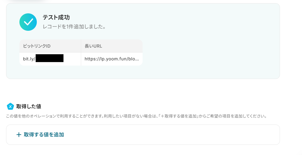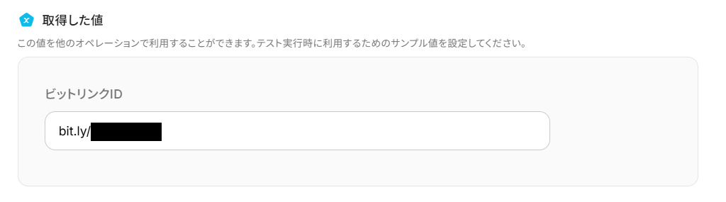 確認できたら、「取得した値」にテスト用としてをビットリンクIDを手動で入力しましょう。