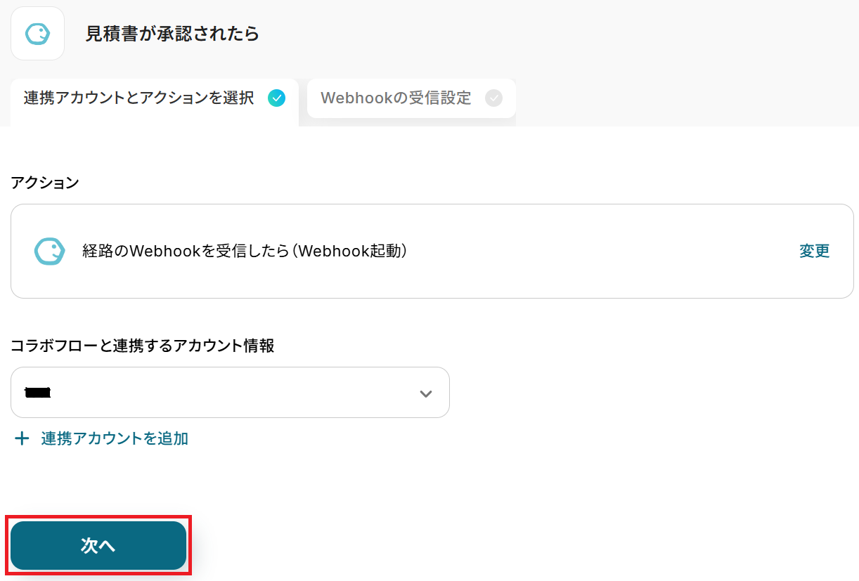 タイトル と連携するアカウント情報 を任意で設定し、アクションはテンプレート通りに「経路のWebhookを受信したら(Webhook起動)」のまま「次へ」をクリックします。