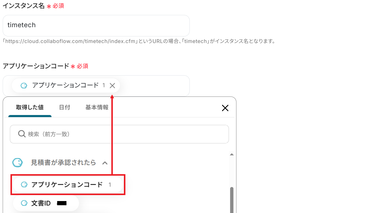 テキストボックス下部の説明通りに、URLを参照してインスタンス名 を入力しましょう。アプリケーションコード については、トリガーで取得した値が予め設定されているのでそのままで大丈夫です。 ※以下のように取得した値を設定することで、トリガーが実行されるたびに最新の情報を反映できます。