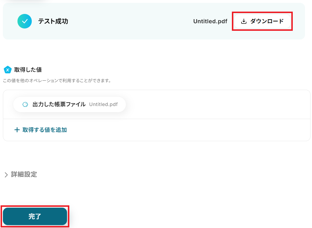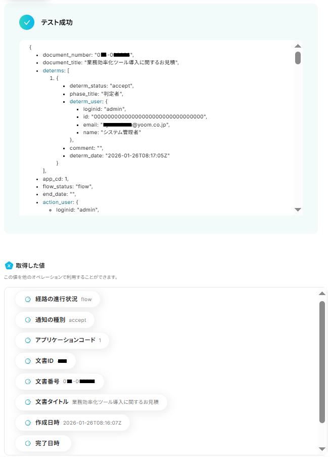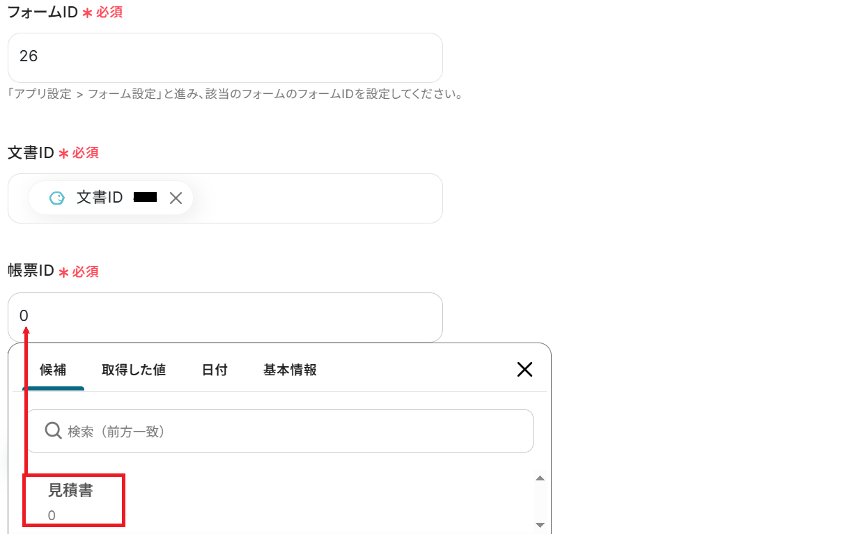 文書ID の欄にも、同じくトリガーで取得した値が既に設定されています。 最後にテキストボックス下部の説明通りにフォームID を入力し、帳票ID を候補から選択してテストしてください。
