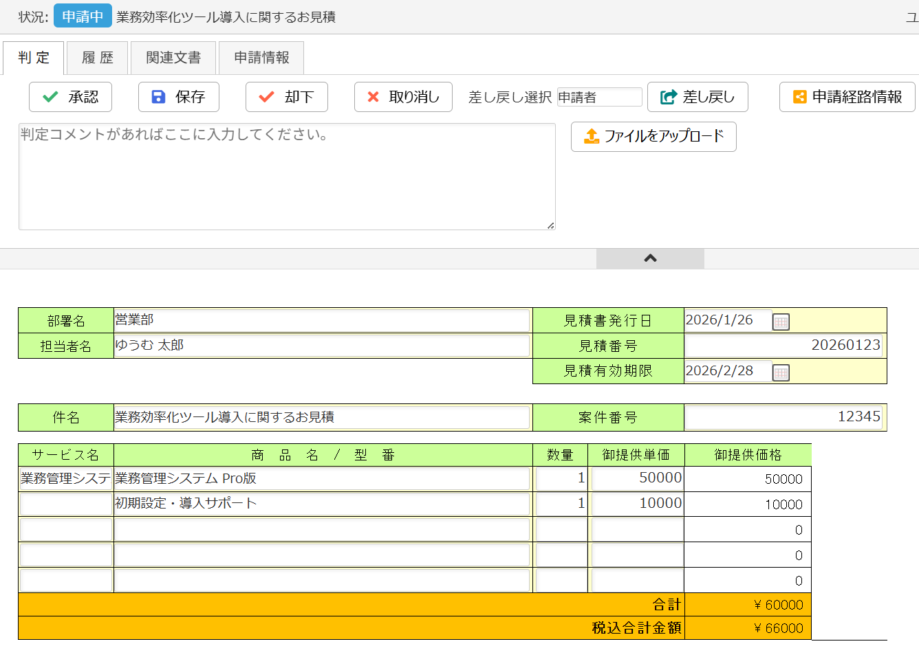 Mazricaの案件情報を使って、コラボフローで見積書を申請するフローです。