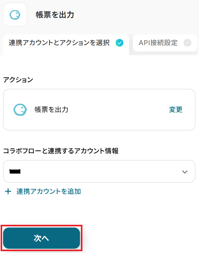 ステップ3と同様、アクションは「帳票を出力」のまま「次へ」をクリックします。