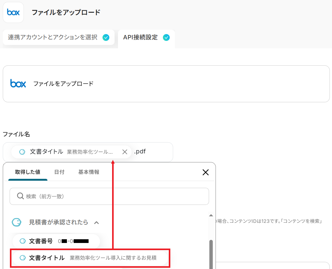 ステップ5:Boxのアクション設定 先ほど出力した帳票をBoxに格納します。