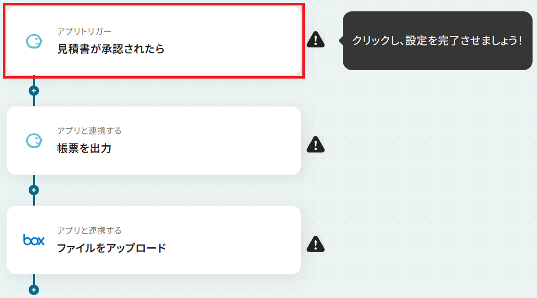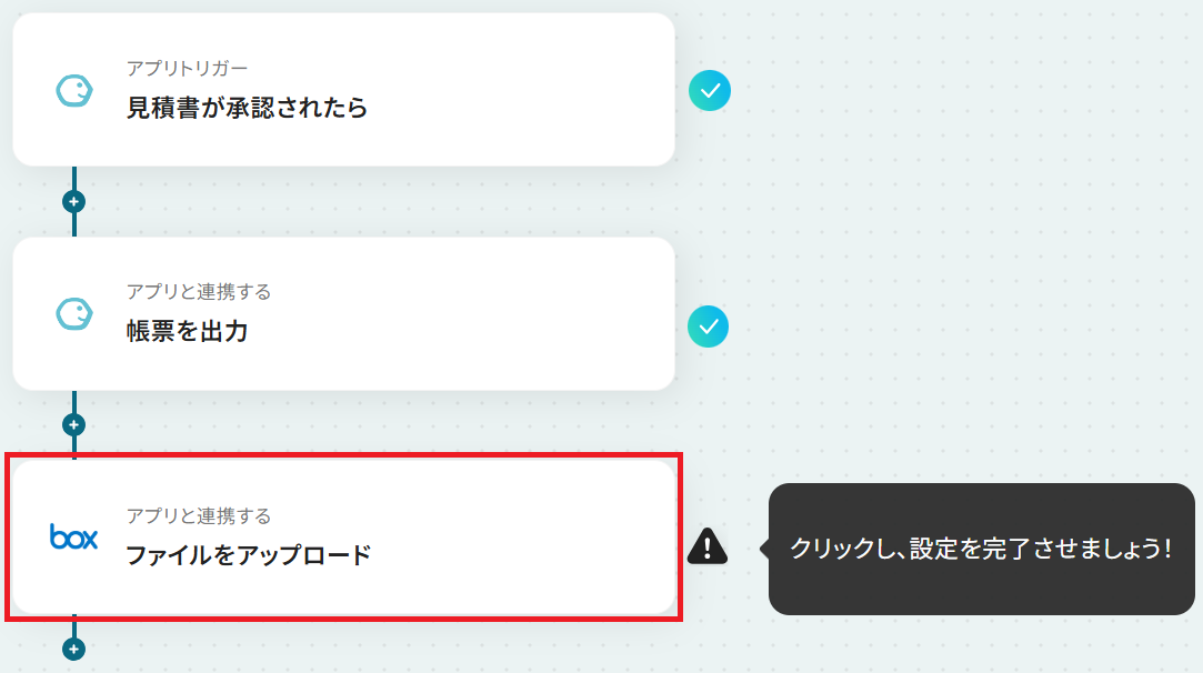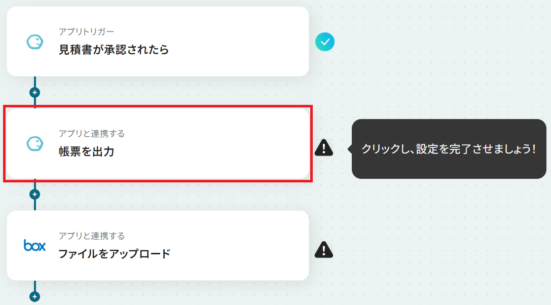 はじめに、コラボフローとDropboxをYoomと連携します。 次に、トリガーでコラボフローを選択し、「見積書が承認されたら」というアクションを設定します。 続いて、オペレーションでコラボフローの「帳票を出力」アクションを設定します。 最後に、オペレーションでDropboxの「ファイルをアップロードする」アクションを設定し、出力した帳票ファイルを指定のフォルダにアップロードします。 ※「トリガー」:フロー起動のきっかけとなるアクション、「オペレーション」:トリガー起動後、フロー内で処理を行うアクション ■このワークフローのカスタムポイント