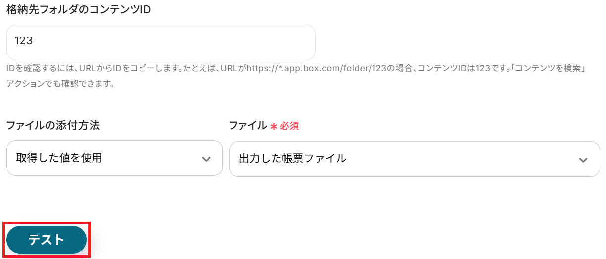 次にテキストボックス下部の説明通りに、格納先フォルダのコンテンツID を入力してください。ファイルの添付方法 ・ファイル は予め設定されている通りでOKなので、そのままテストしましょう。