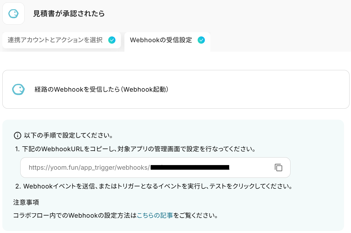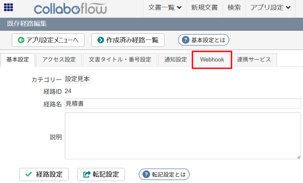 まず経路のWebhook設定 を参考に、コラボフローの設定画面でWebhook設定を行ってください。