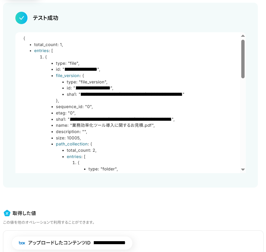 コラボフローのトリガー設定では、任意の経絡の承認時にWebhook通知されるように設定してください Boxにファイルをアップロードするオペレーションでは、保存する際のファイル名や、格納先となるフォルダのコンテンツIDを任意で設定してください ■注意事項