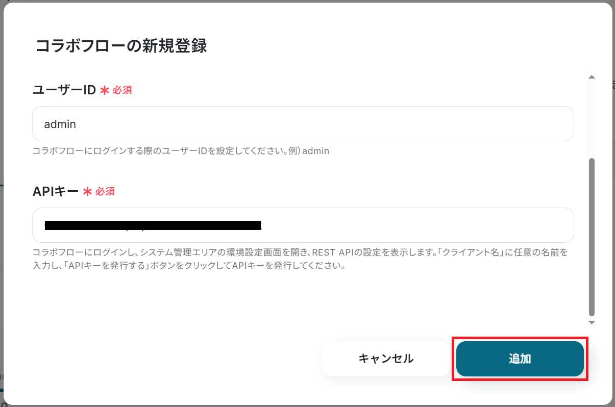 任意のユーザーID と、先ほど取得したAPIキー を入力し「追加」をクリックするとマイアプリ連携完了です。