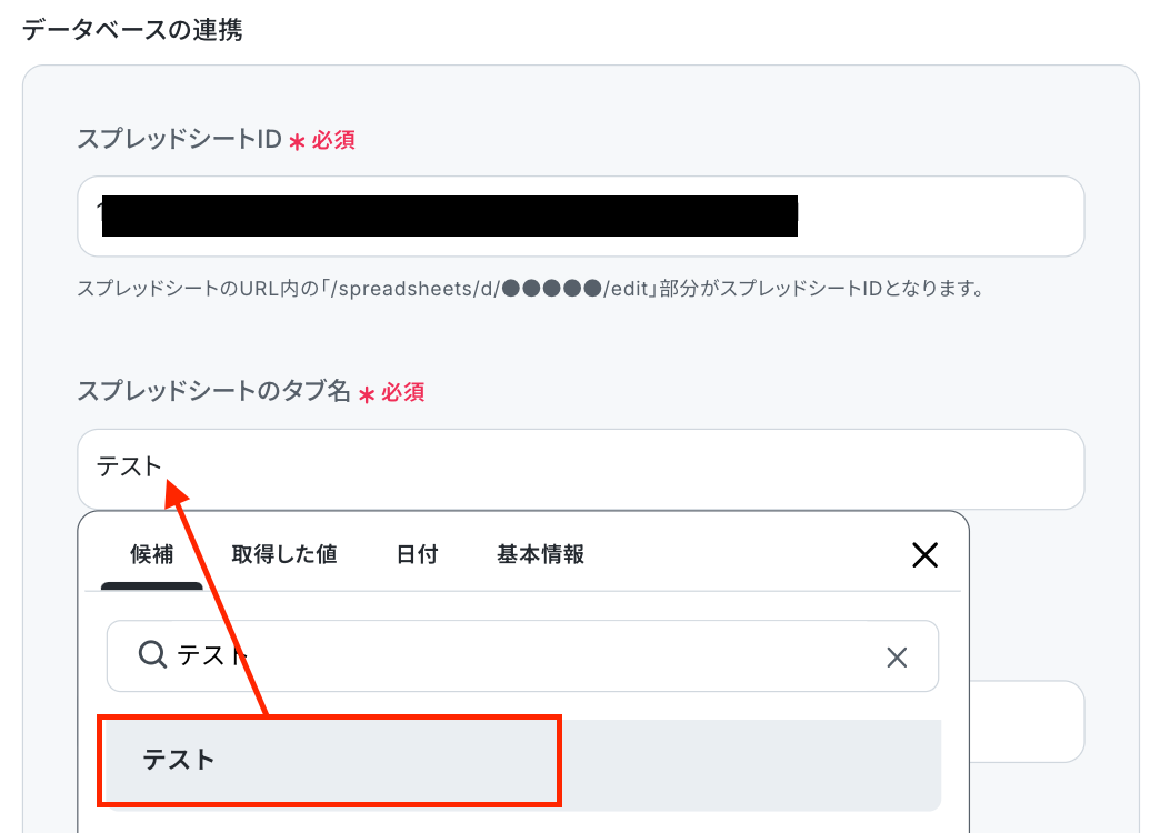 次の画面で、レコードを追加したいスプレッドシートIDとタブ名を設定していきます! 「候補」から選択してください。
