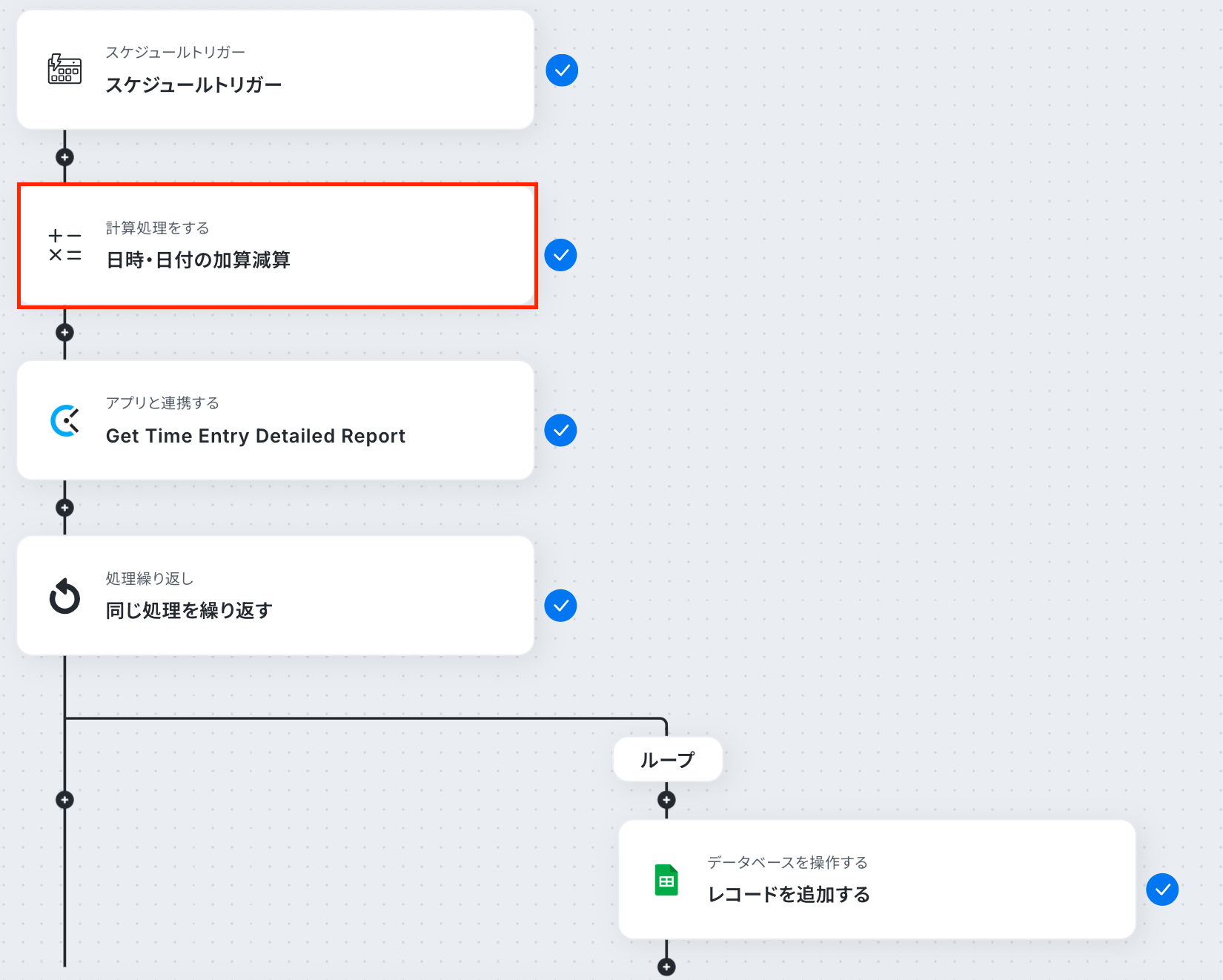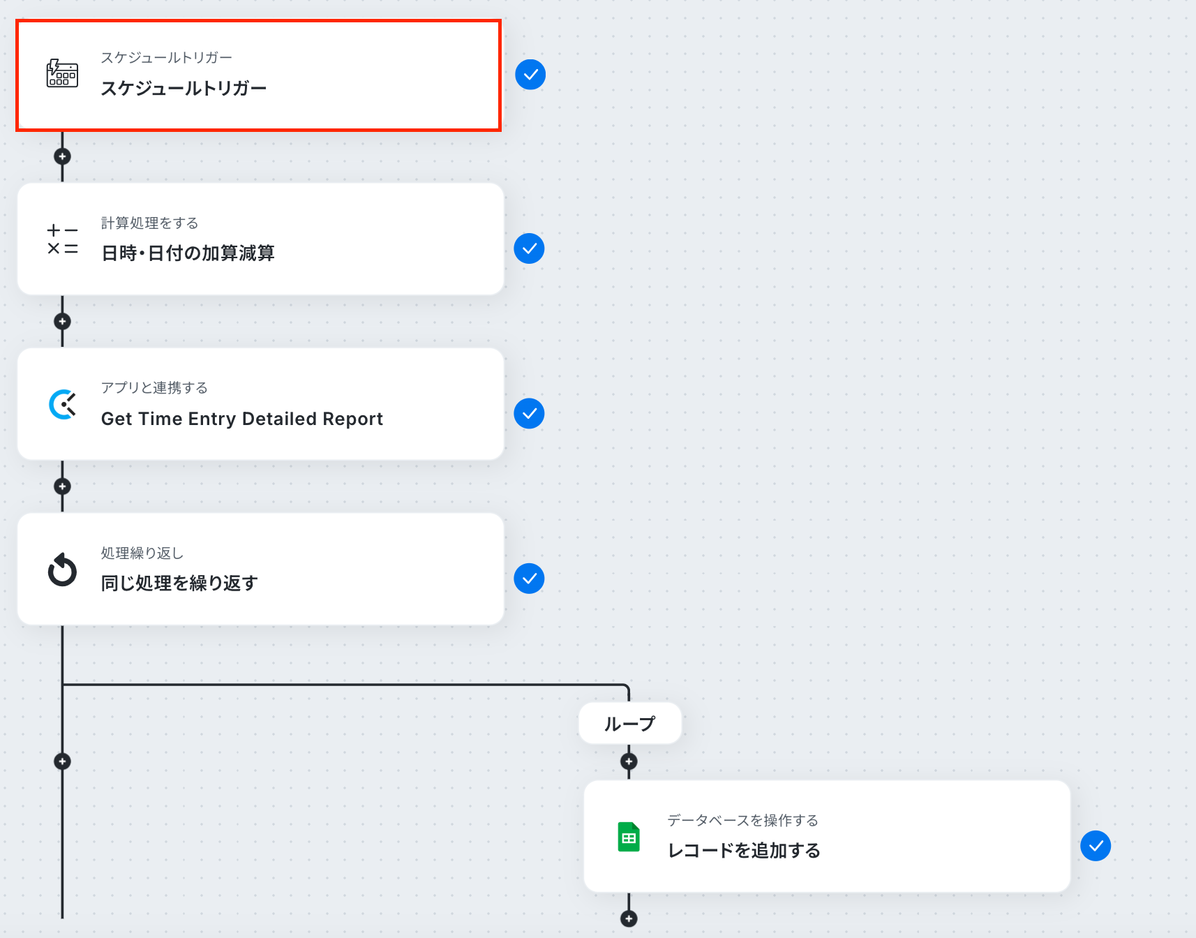 スケジュールトリガーでは、レポートを取得したい頻度や時間帯(毎日、毎週、毎月など)を任意で設定してください。 計算機能では、日付変数を利用して、レポート取得に使用する日付を任意で算出できます。 Clockifyでレポートを取得する際に、ステータスやタグといった任意の条件を指定し、必要なデータのみをエクスポートすることが可能です。 繰り返し処理(ループ)機能では、Google スプレッドシートに1件ごとに記録したい任意の情報を設定してください。 Google スプレッドシートにレコードを追加する際、登録先のシートや、どのデータを追加するかといった内容は自由にカスタマイズできます。 ■注意事項