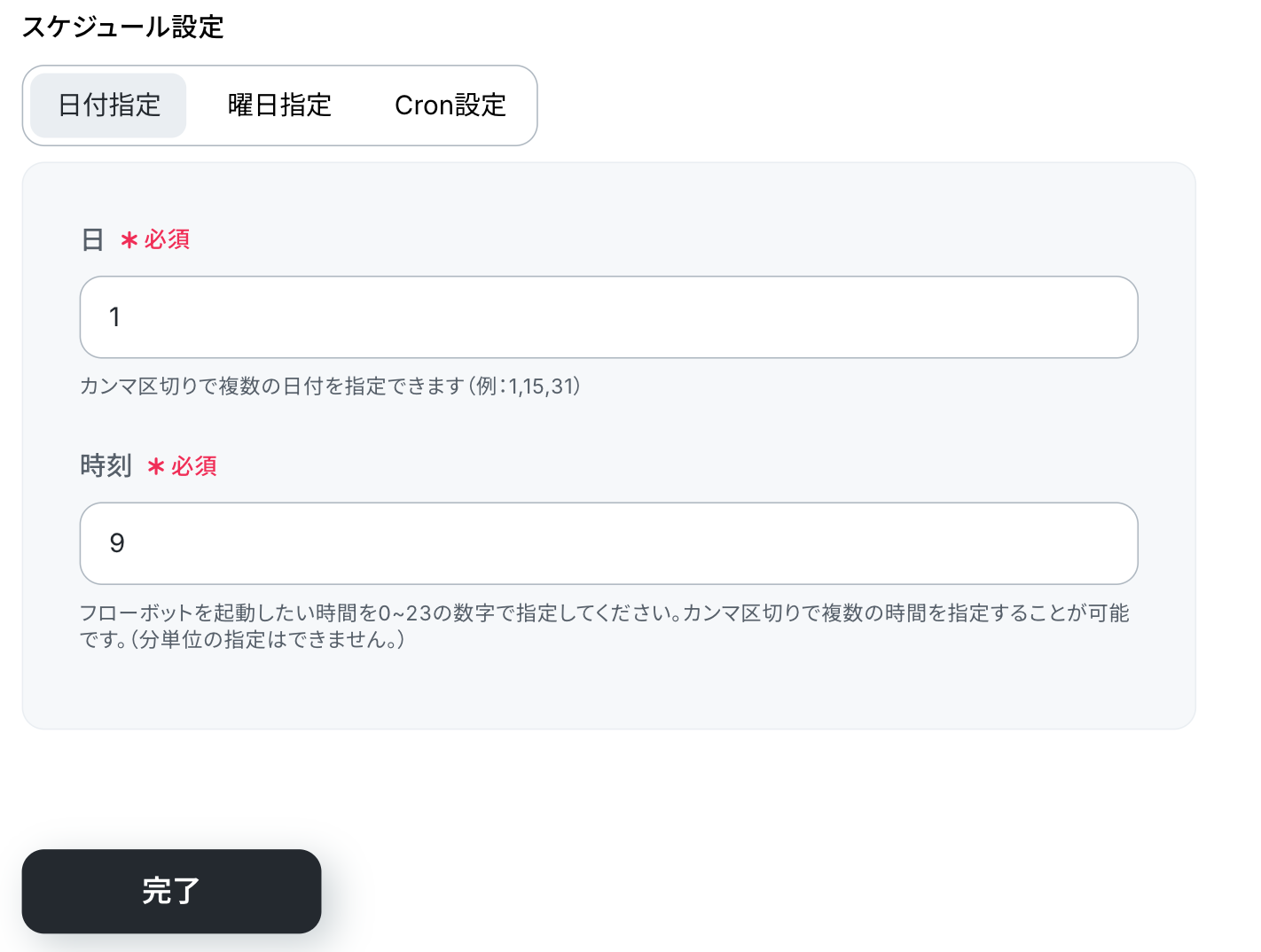 「スケジュール設定」では、フローボットを起動したい日付や時刻を設定します。 今回は以下の設定にしましたが、自由に設定してOKです。 設定を終えたら「完了」をクリックしましょう!