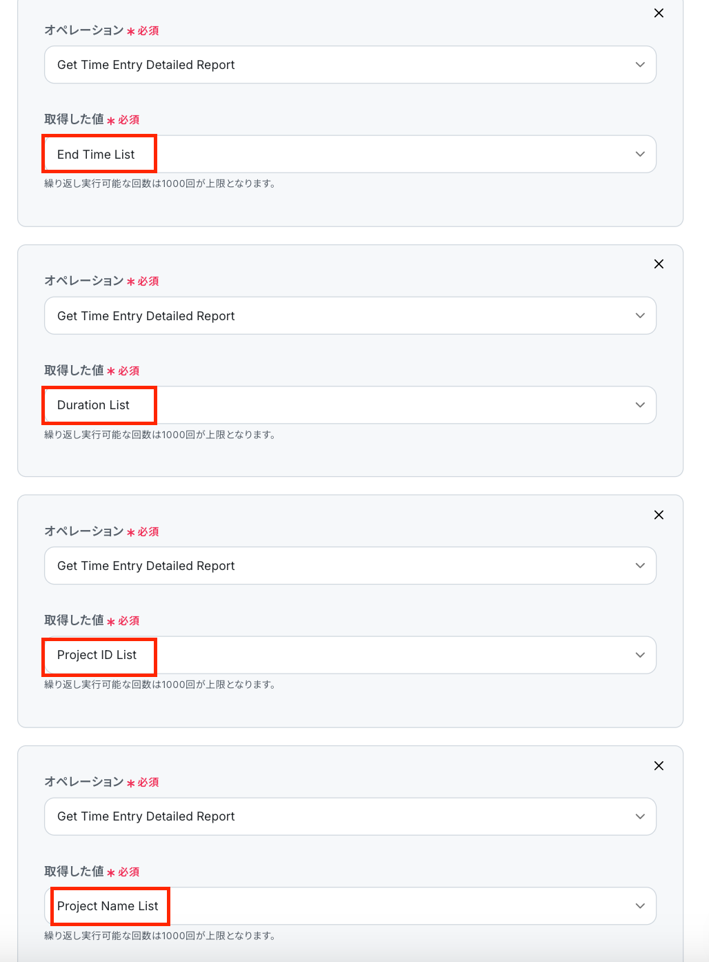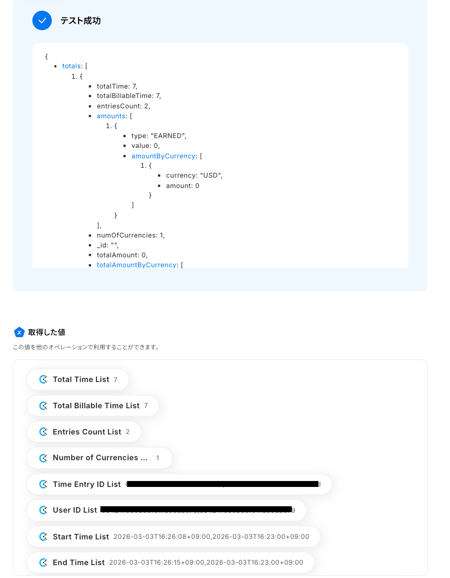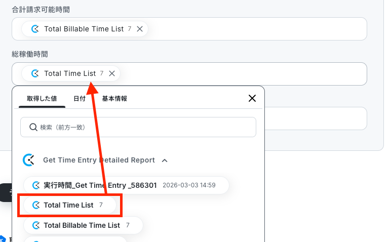 なお、「Total Time List」や「Total Billable Time List」は、取得した値が単一の項目のため、Clockifyの取得した値から引用して設定しましょう。