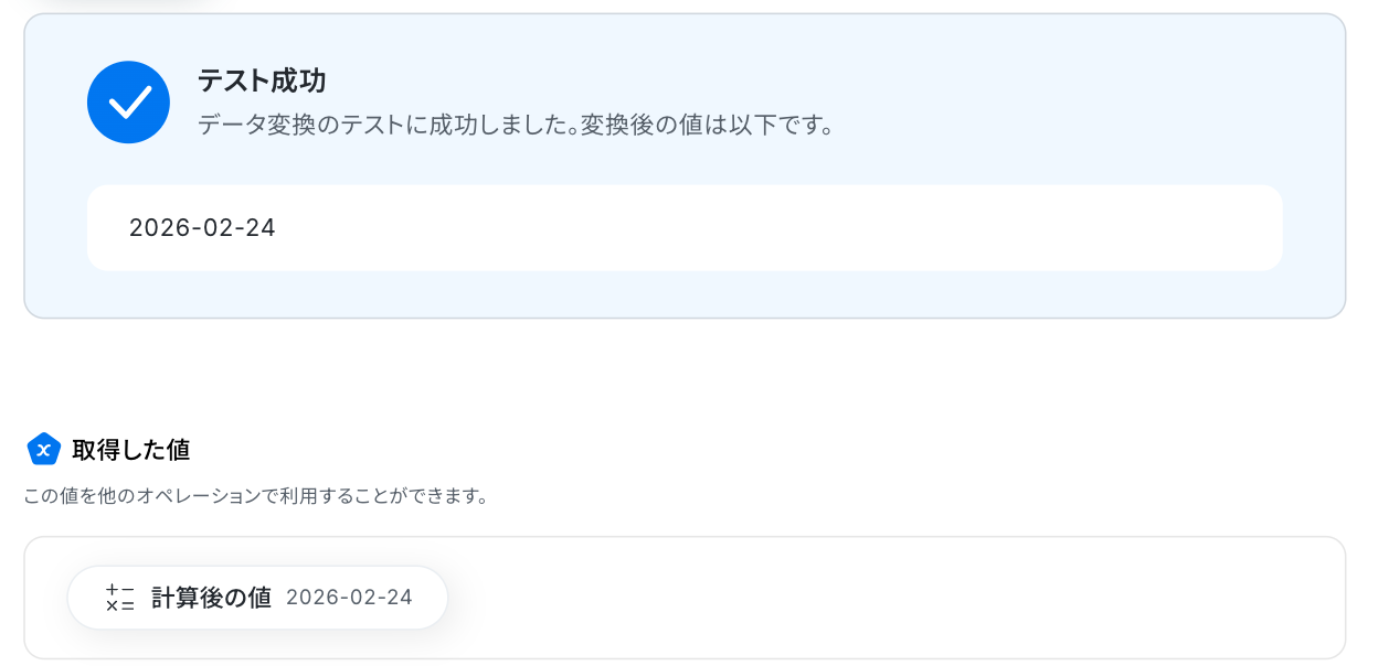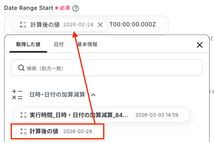 ステップ4:日時・日付の加算減算設定 ここでは、日付形式のデータに対して、特定の日数を引き、特定の日時を取得する設定を行います。 赤枠部分をクリックしましょう。 ※詳細は以下のリンクをご確認ください。日時・日付の加算減算について