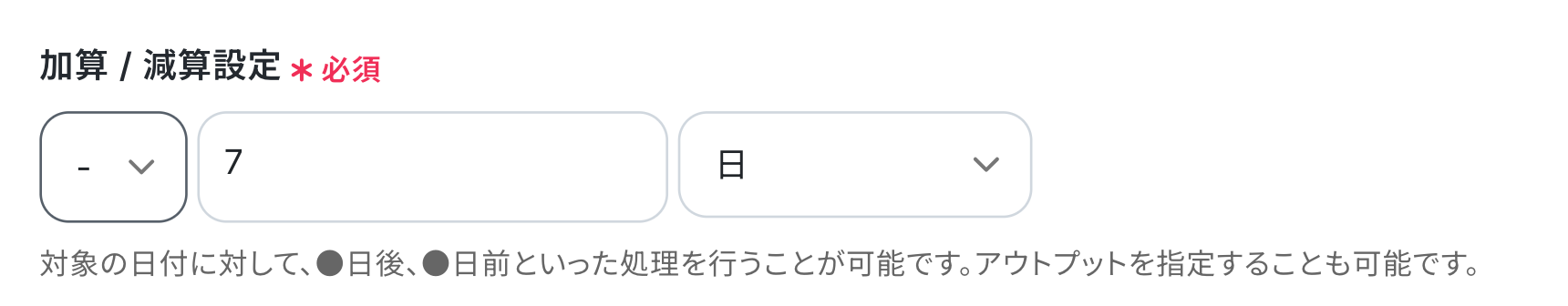 「加算/減算設定」 は、入力欄下の注釈を参考にして、設定します。 ここでは、先ほど指定した日付から7日前の日付を取得したいので、以下のように設定しました。