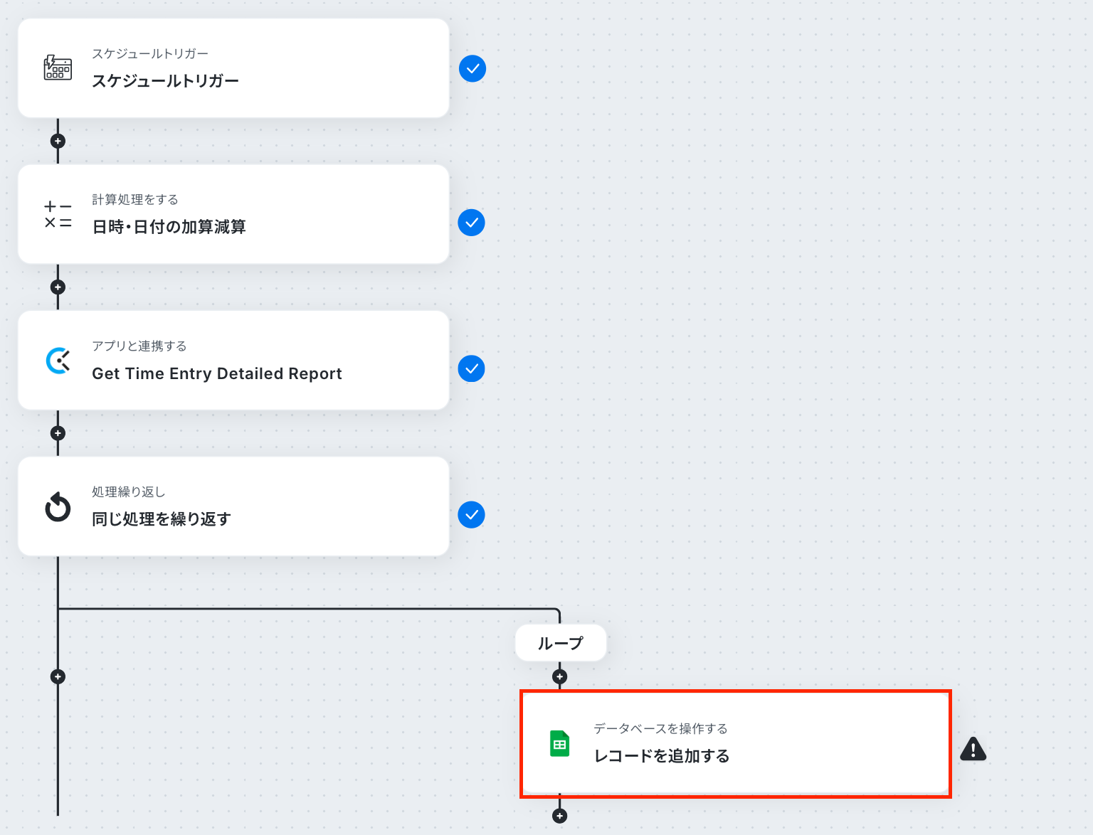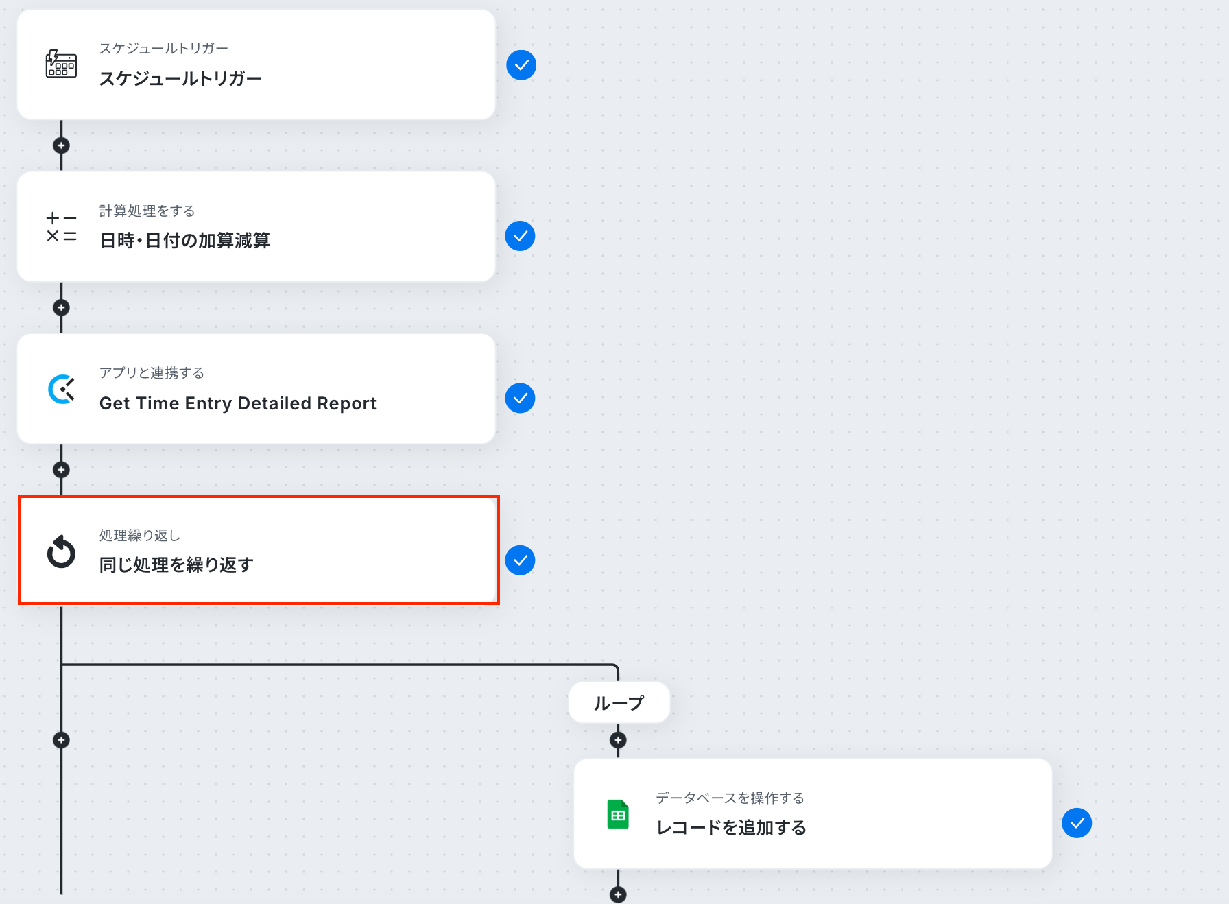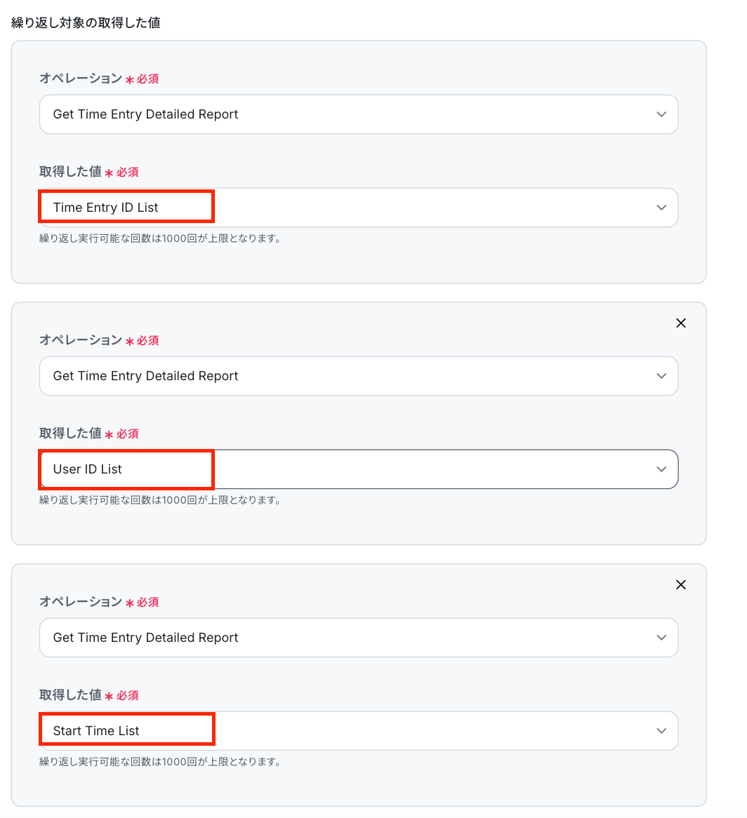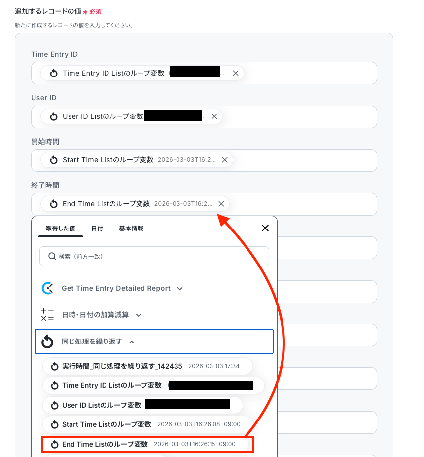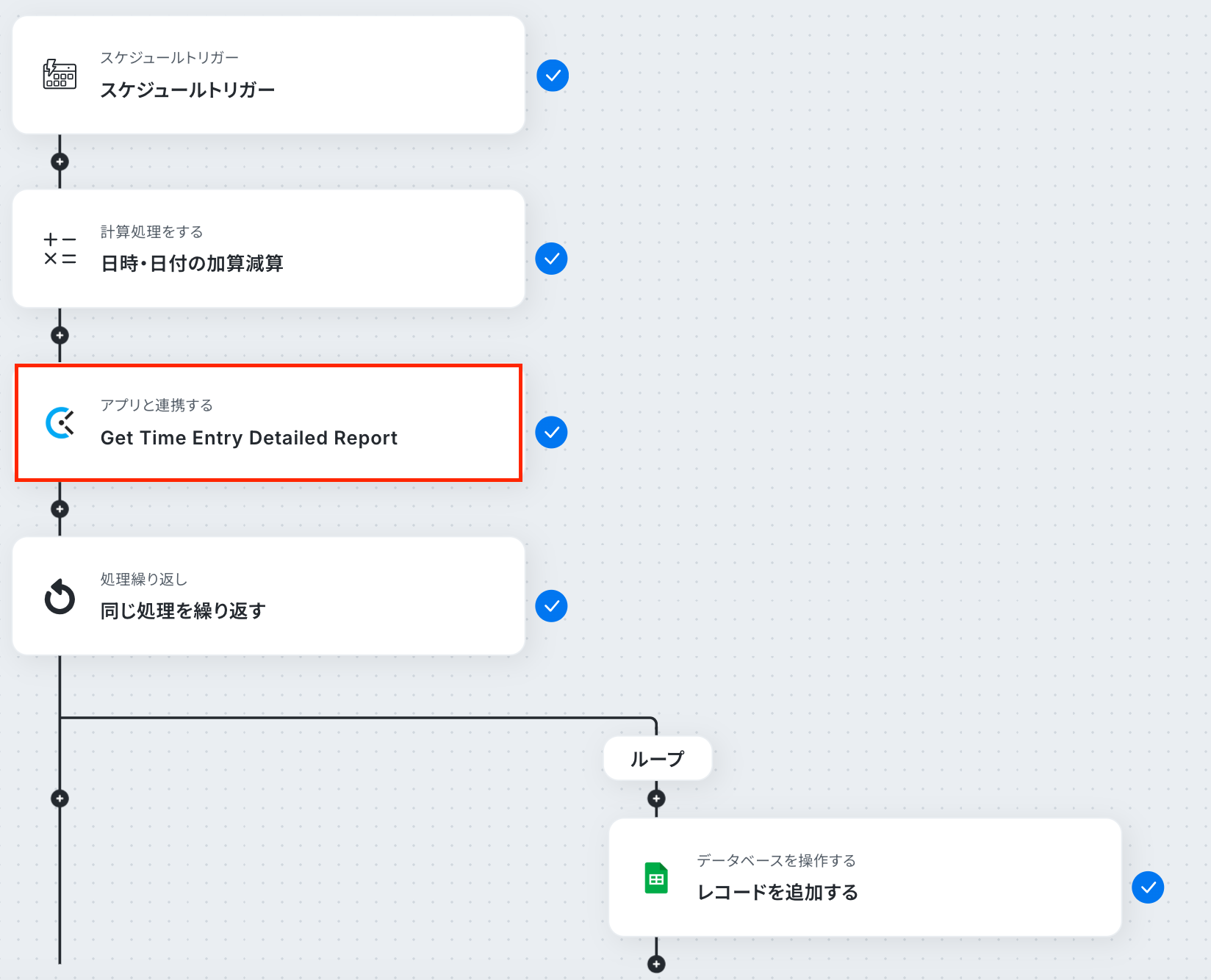 次の画面で、「繰り返し対象の取得した値」を設定します。 「オペレーション」は、「Get Time Entry Detailed Report」を選択してください。 「取得した値」は、Google スプレッドシートにレコードを追加することを想定して、先ほどのステップで取得した値を設定しましょう! 今回は、以下のように設定しています。 「完了」をクリックし、次のステップに進んでください!
