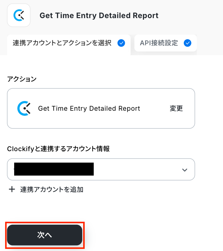 ステップ5:Clockifyのアクション設定 Clockifyで詳細なタイムエントリリポートを取得する設定を行っていきます! 赤枠部分をクリックしてください。